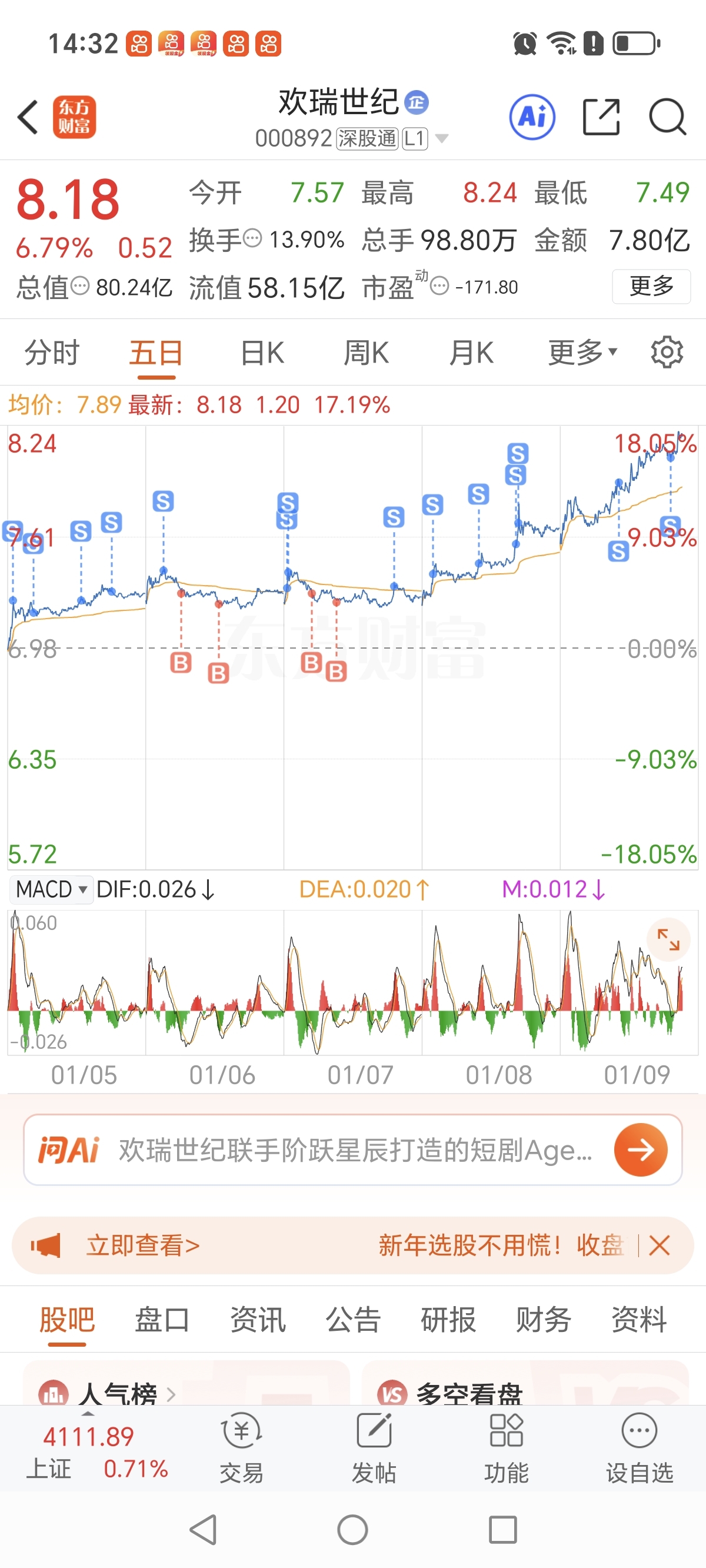 $欢瑞世纪(SZ000892)$ 谢谢大哥,留100股纪念