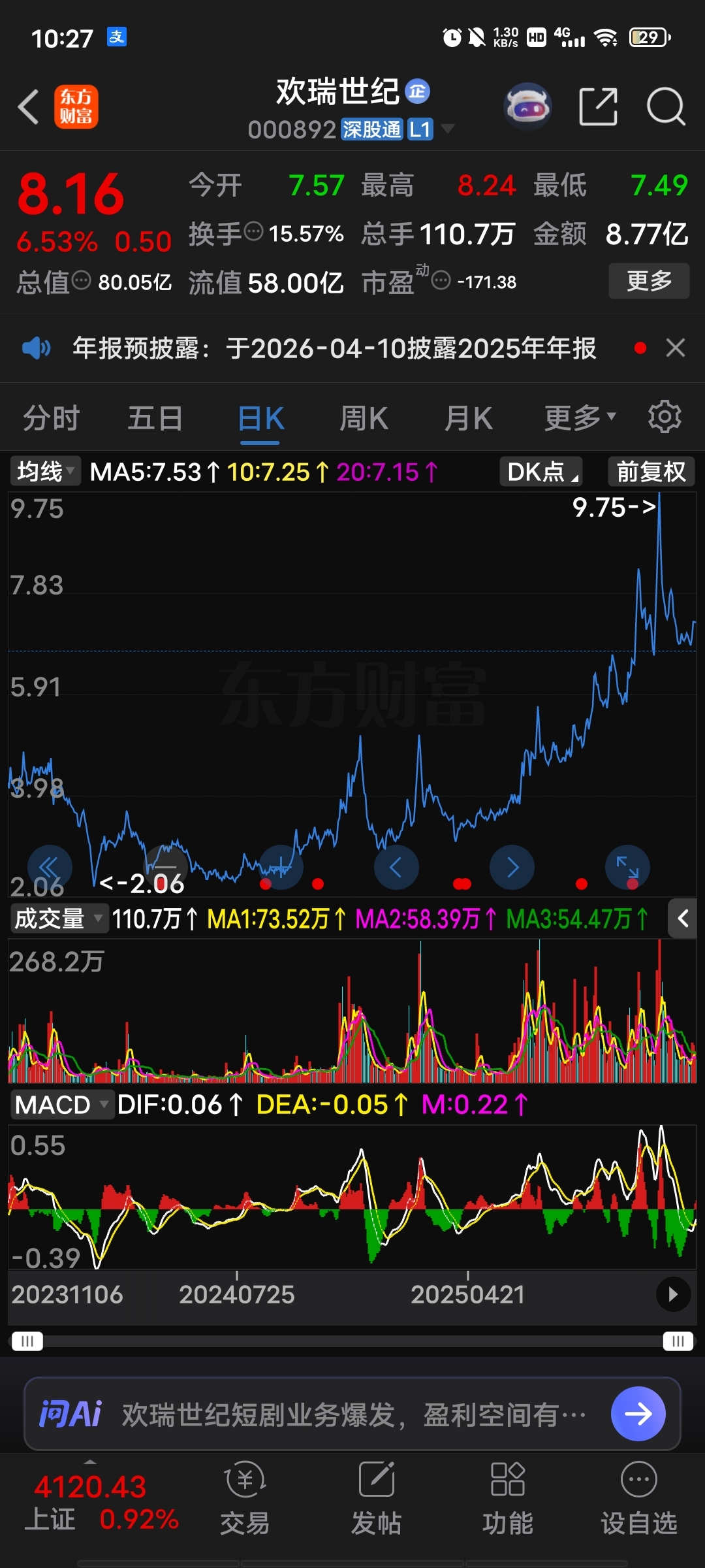 $欢瑞世纪(SZ000892)$ 6.5本躺尸。