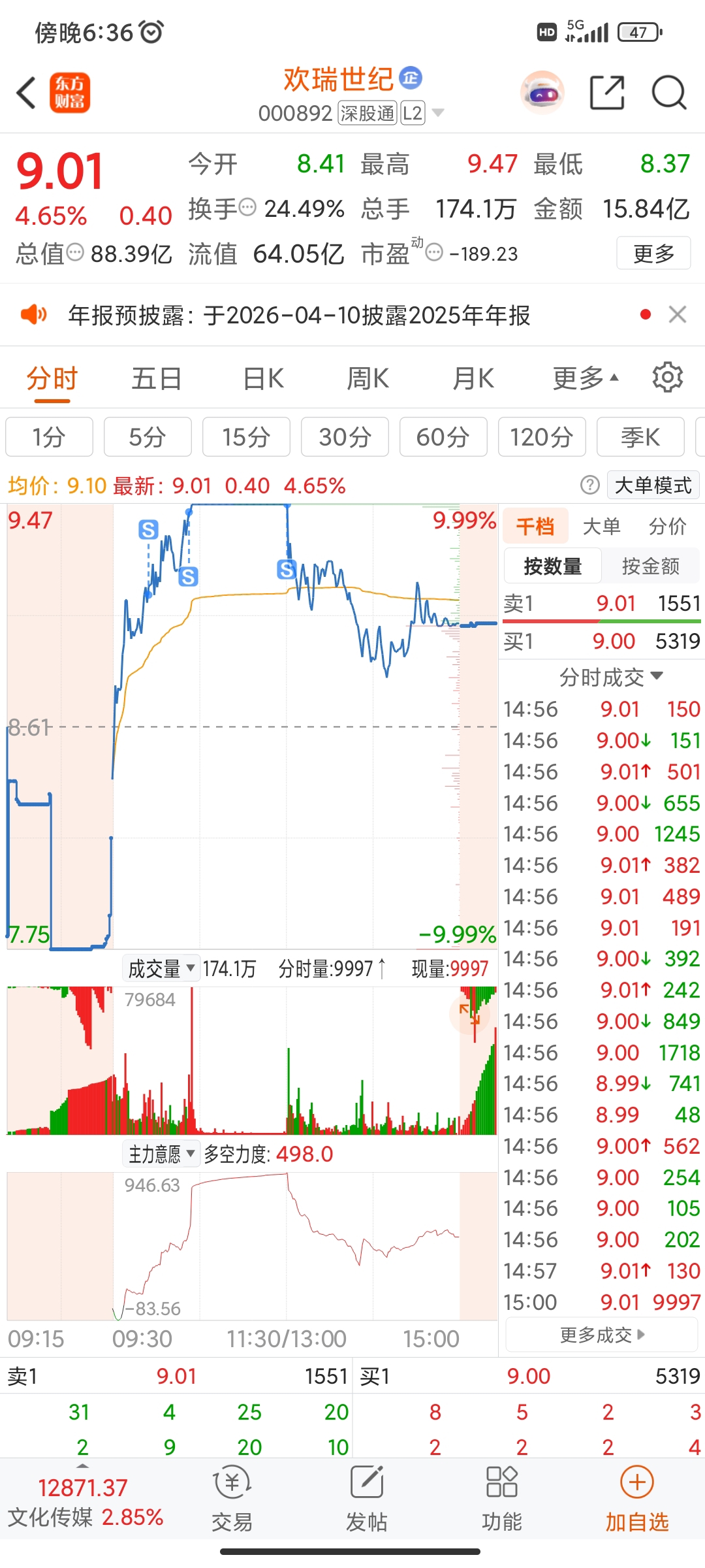 $欢瑞世纪(SZ000892)$ 村里人,真是恶心,午盘休市放利空,下午开盘全砸出来了,还好格局