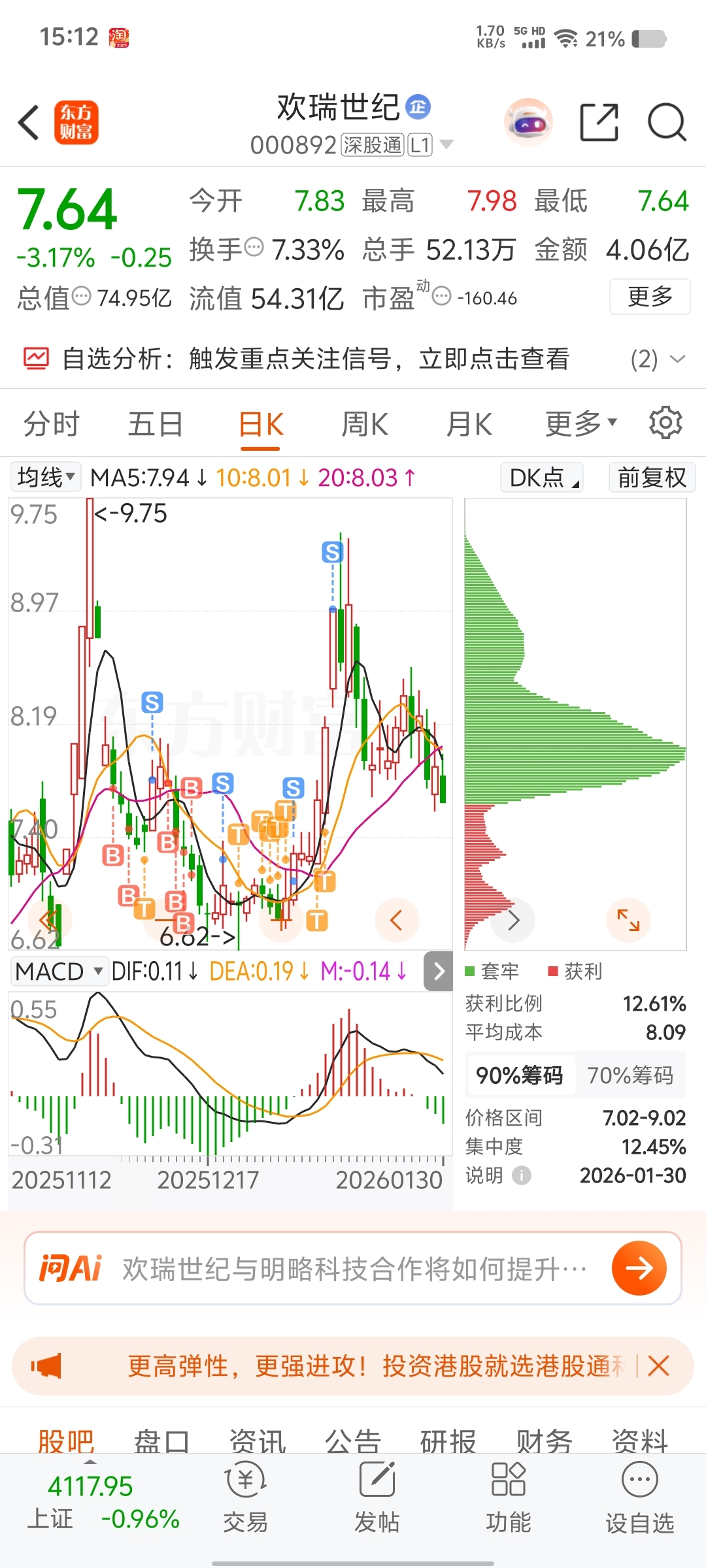 $欢瑞世纪(SZ000892)$ 继续空仓,到位置再进