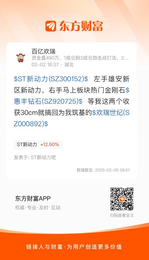 $ST新动力(SZ300152)$ 左手雄安新区新动力,右手马上板块热门金刚石$惠丰钻石(SZ920725)$ 等我这两个收获30cm就搞回为我筑基的$欢瑞世纪(SZ000892)$