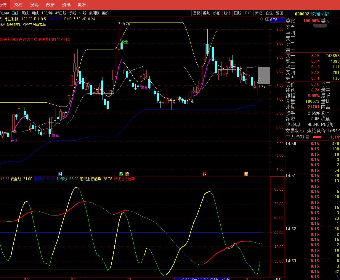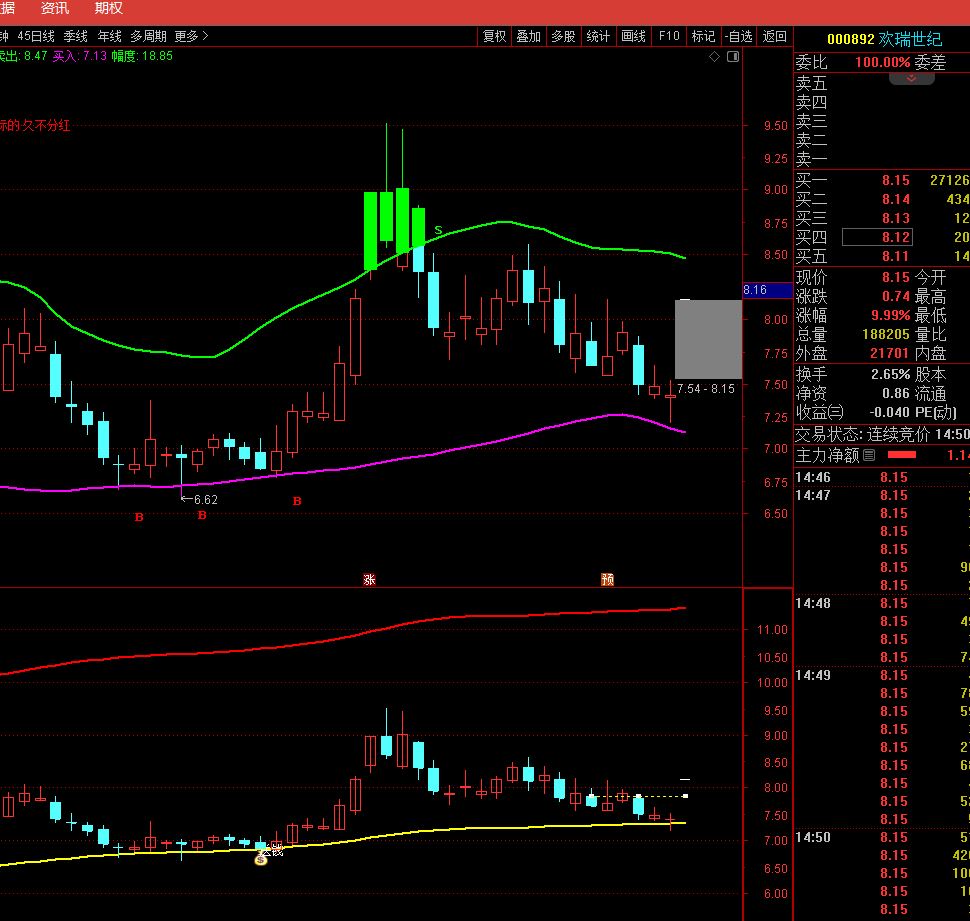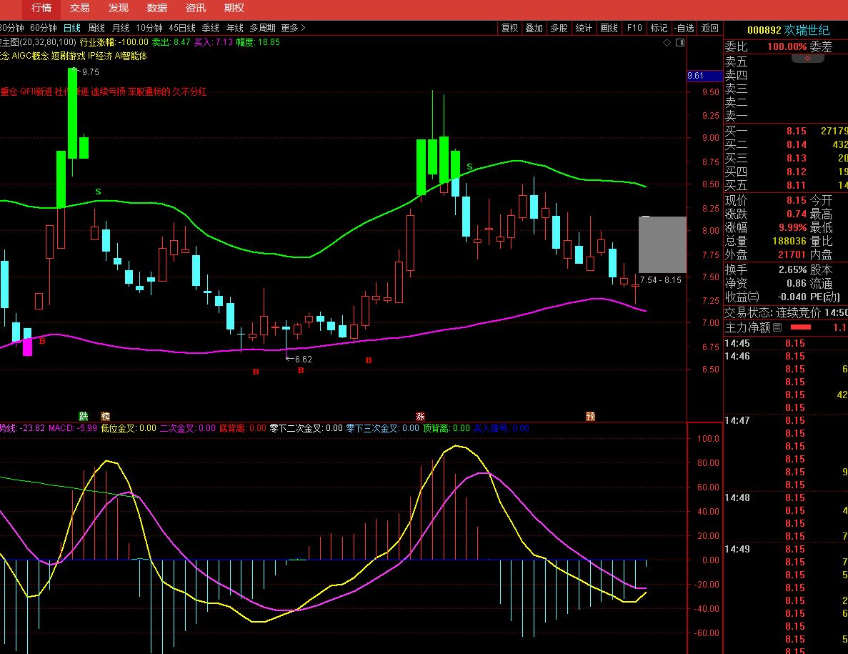看看欢瑞世纪还能涨多高。今天影视音像在所有板块中涨幅排在第一,这个票利好这里不用多说,看看指标来自己来判断后面的趋势和高点吧!