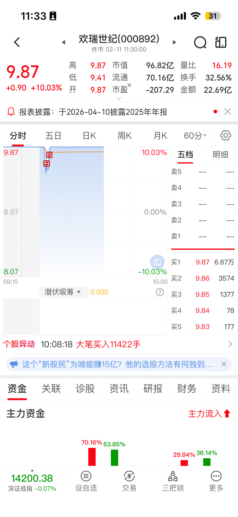 $欢瑞世纪(SZ000892)$ 今天进来这么多吗?