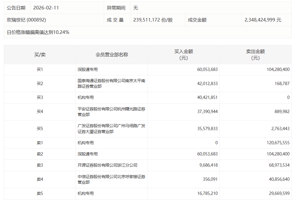 欢瑞世纪今日涨停 2家机构专用席位净卖出1.34亿元