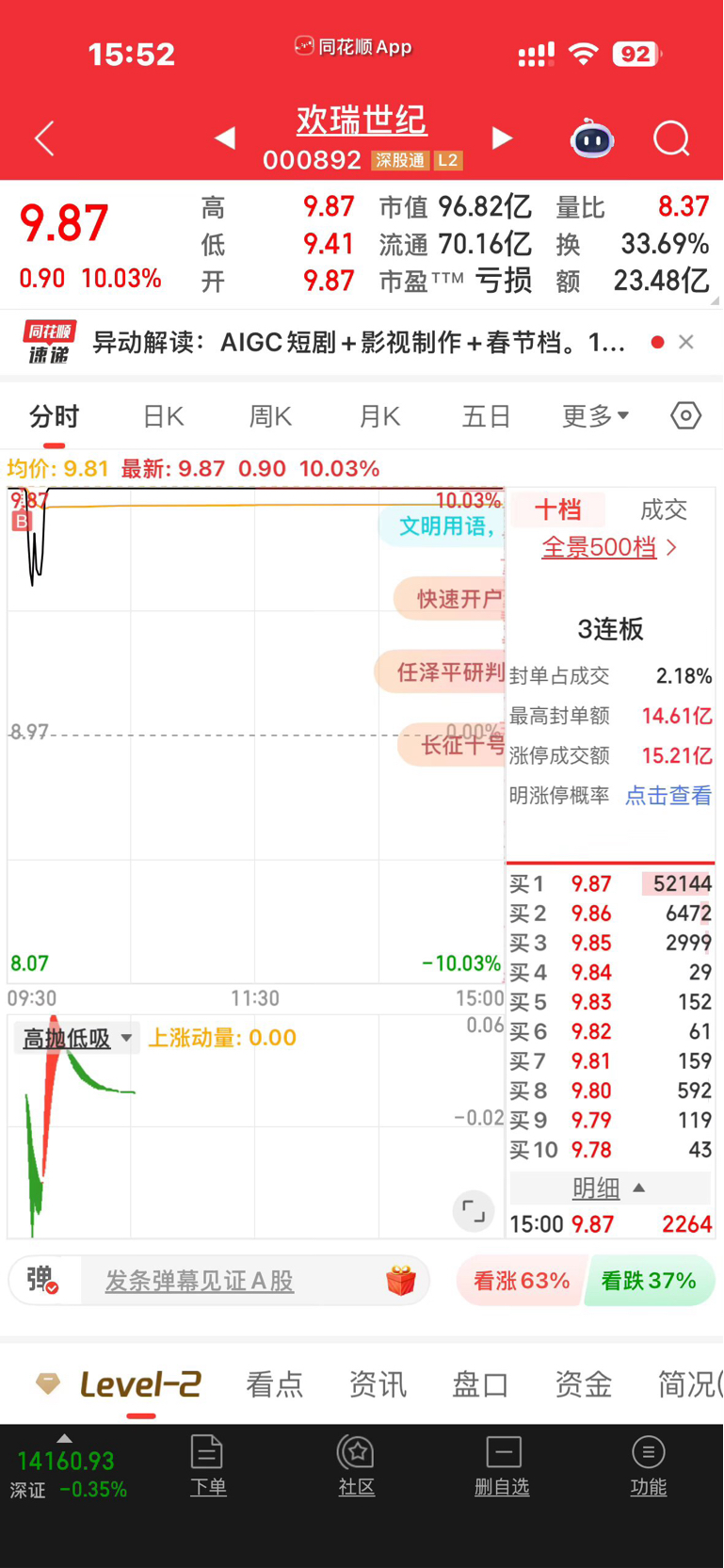 2月11日涨停解码:买入:欢瑞世纪《推荐记录请勿跟票,你的赢亏自己负责》