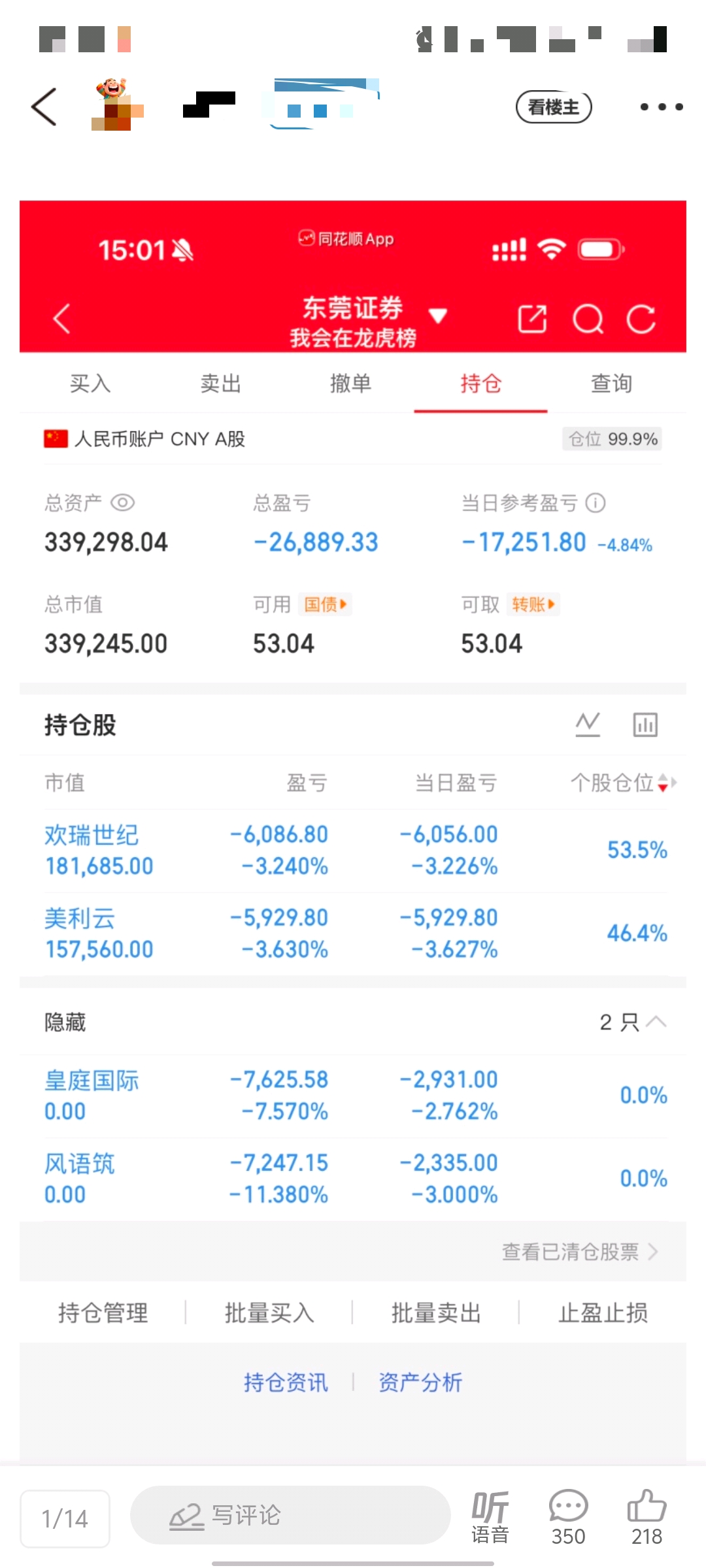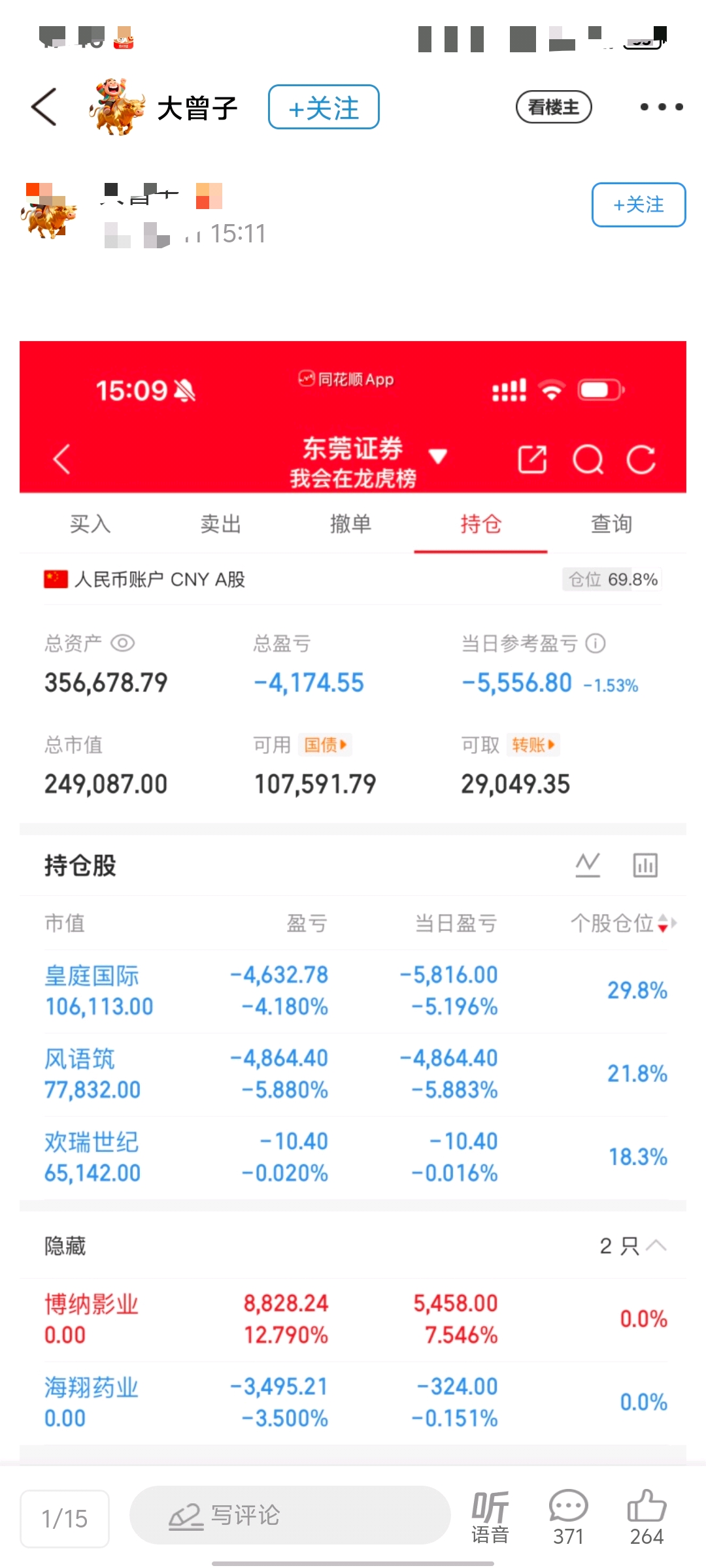 欢瑞的各位道友小心了,曾子已经补重仓了,明天堪忧啊