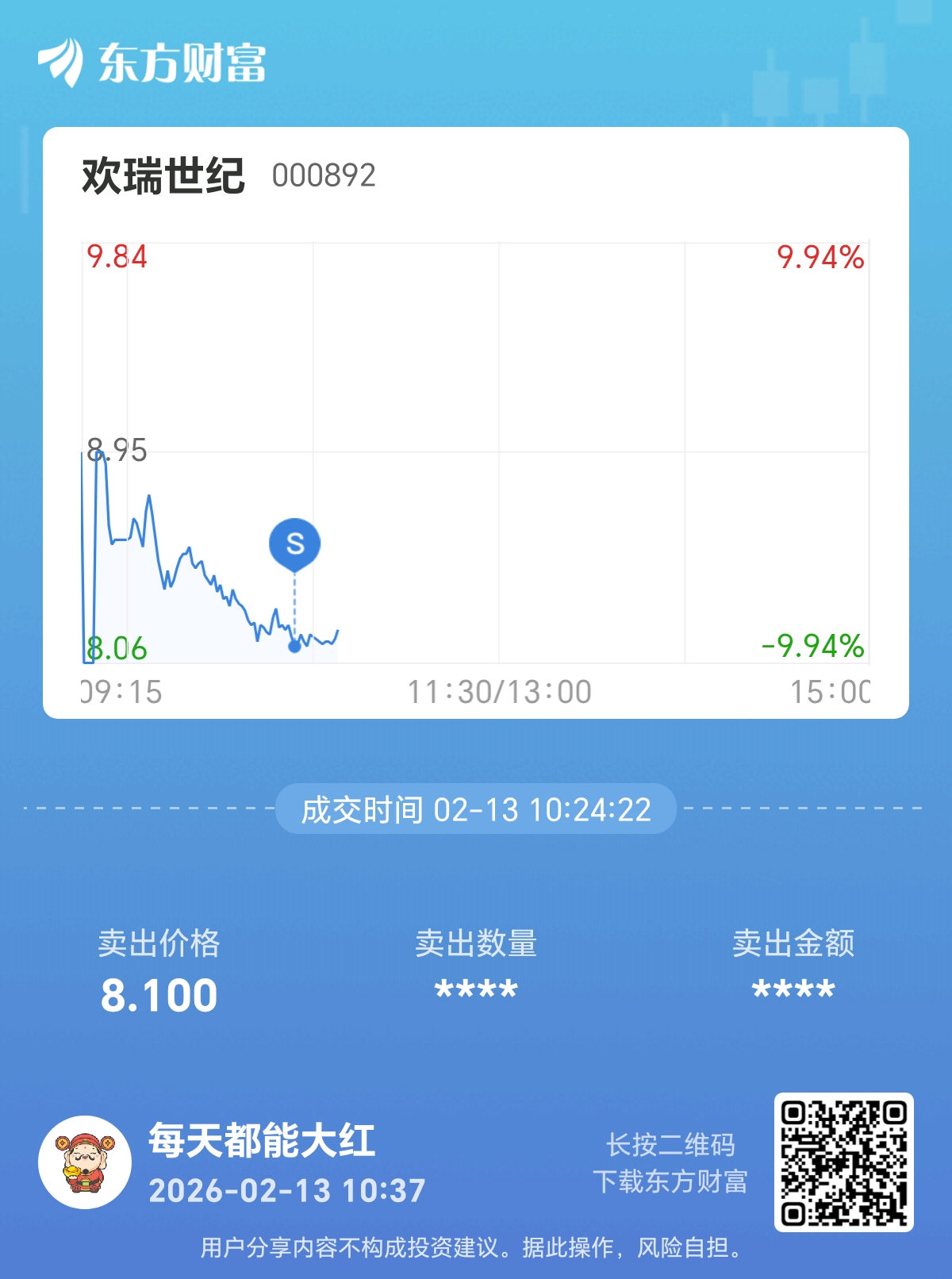 $欢瑞世纪(SZ000892)$ 88留下的发财