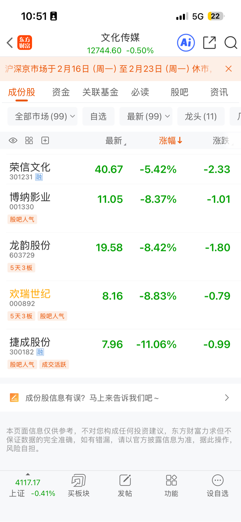$欢瑞世纪(SZ000892)$ 果然是龙头,下跌总龙头!