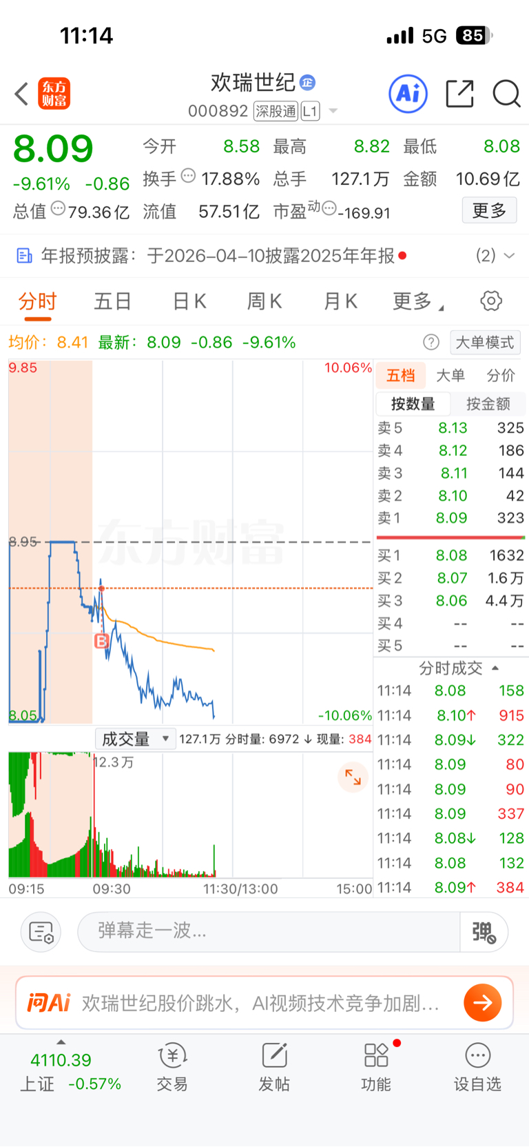 $欢瑞世纪(SZ000892)$ ....挂在山顶....买入立马砸