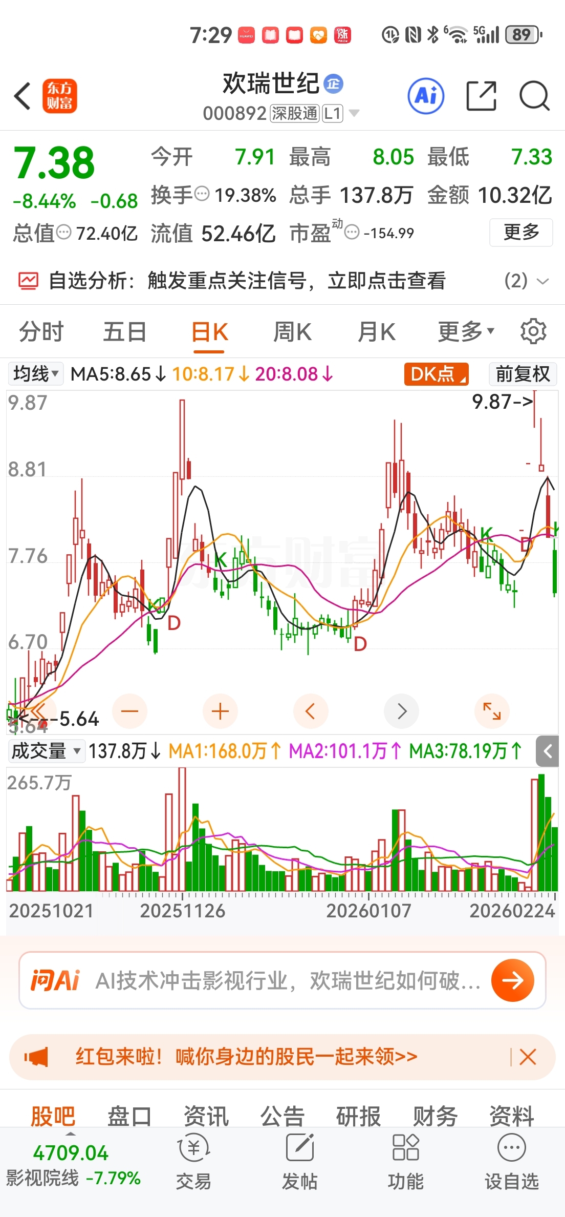 $欢瑞世纪(SZ000892)$ 欢瑞世纪的股东青宥极其一致行动人,司法强制抛售的2300万股,已经抛出了700万股。还有1600万股的抛售压力。股价承压。显然,还有再创新低的可能。一旦抛售完毕,就会像弹簧复原那样,有恢复到1月15日公告之日的股价的内在动能。不排除突破9.87创新高的可能。股东减持,牛市是利好。