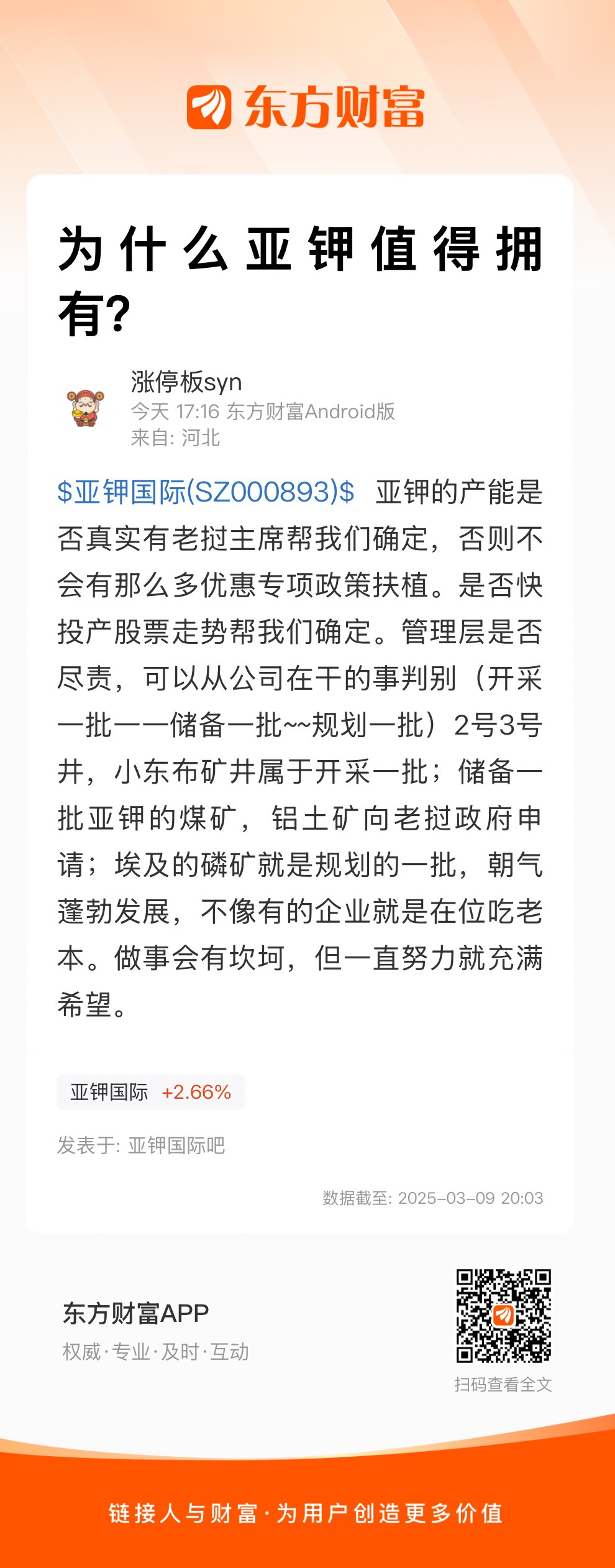 $亚钾国际(SZ000893)$ 亚钾的产能是否真实有老挝主席帮我们确定,否则不会有那么多优惠专项政策扶植。是否快投产股票走势帮我们确定。管理层是否尽责,可以从公司在干的事判别(开采一批一一储备一批~~规划一批)2号3号井,小东布矿井属于开采一批;储备一批亚钾的煤矿,铝土矿向老挝政府申请;埃及的磷矿就是规划的一批,朝气蓬勃发展,不像有的企业就是在位吃老本。做事会有坎坷,但一直努力就充满希望。