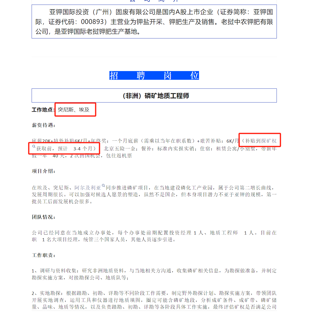 埃及磷矿开发逐步推进中,目前在招聘探矿人才