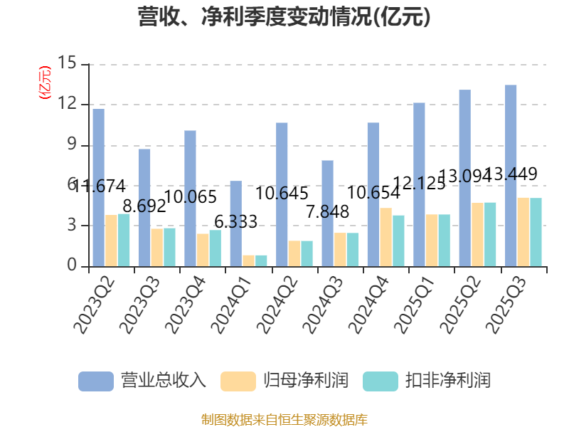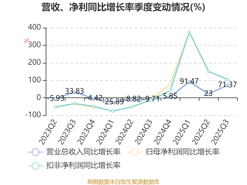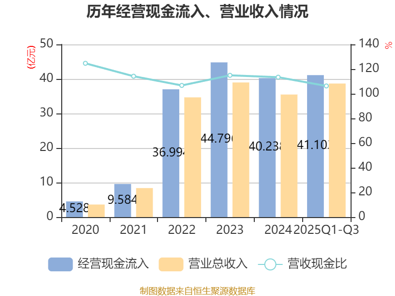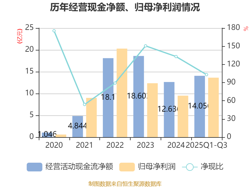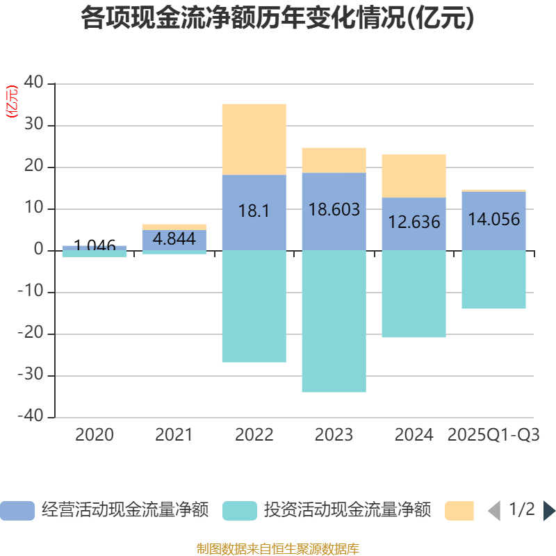 2025年前三季度,公司经营活动现金流净额为14.06亿元,同比增长96.68%;筹资活动现金流净额4447.07万元,同比减少8.52亿元;投资活动现金流净额-13.98亿元,上年同期为-16.63亿元。