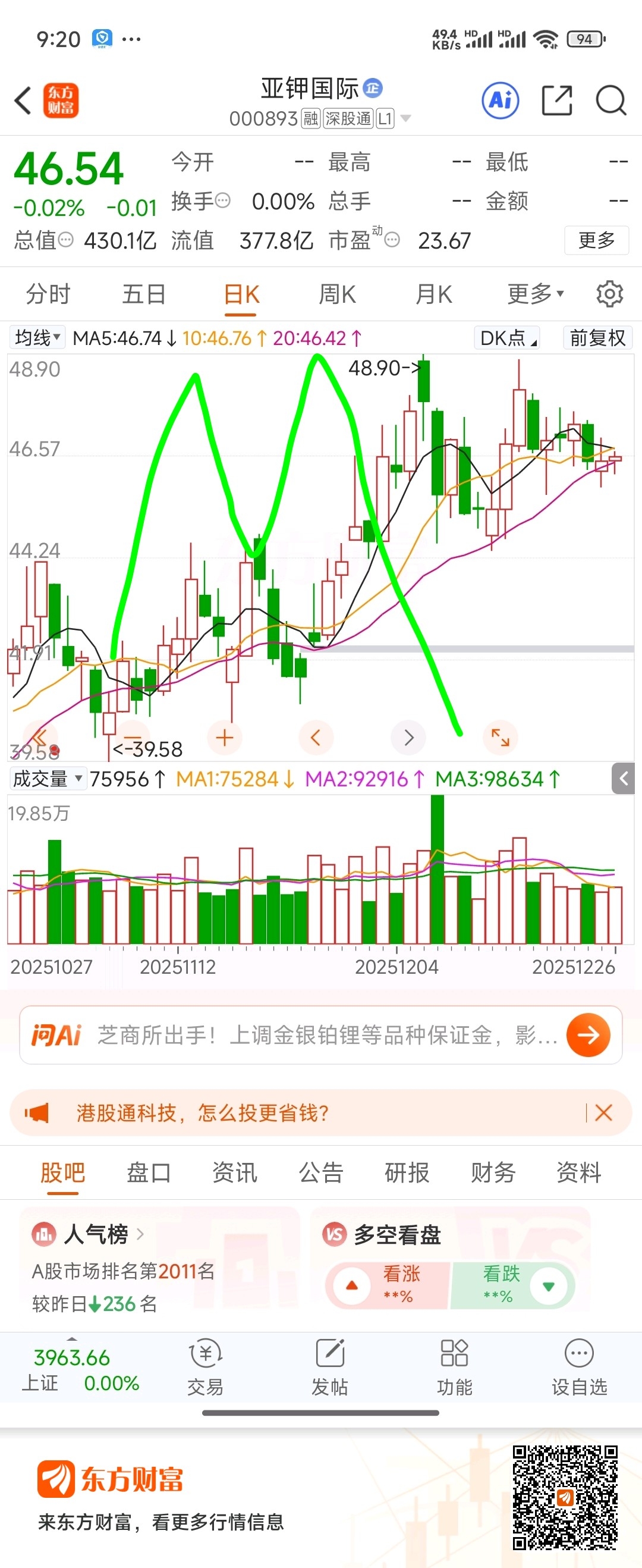 $亚钾国际(SZ000893)$ 管理层减持结束了,小东布投产、钾肥涨价,如果还跌,然后你懂的。。。。M的雏形