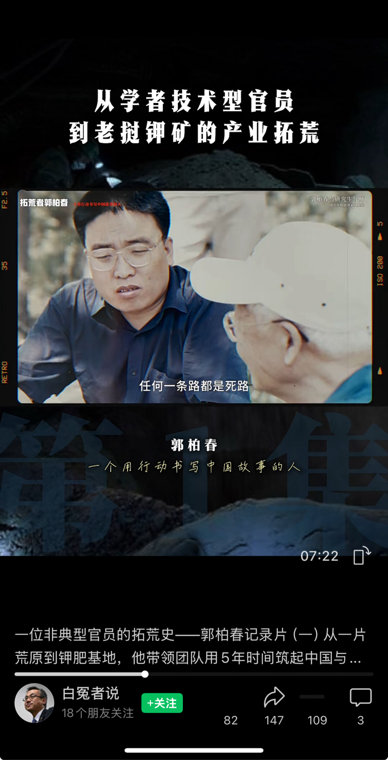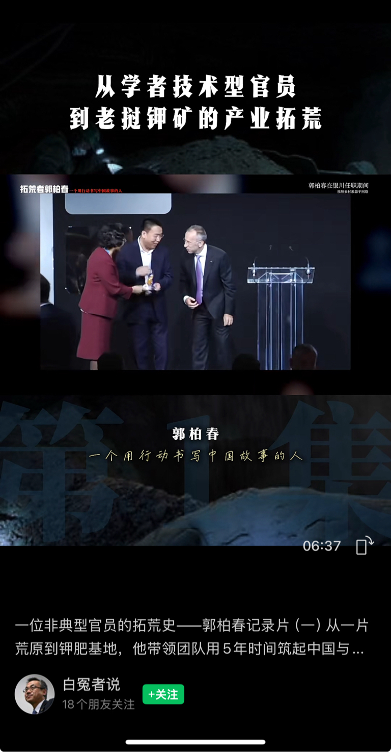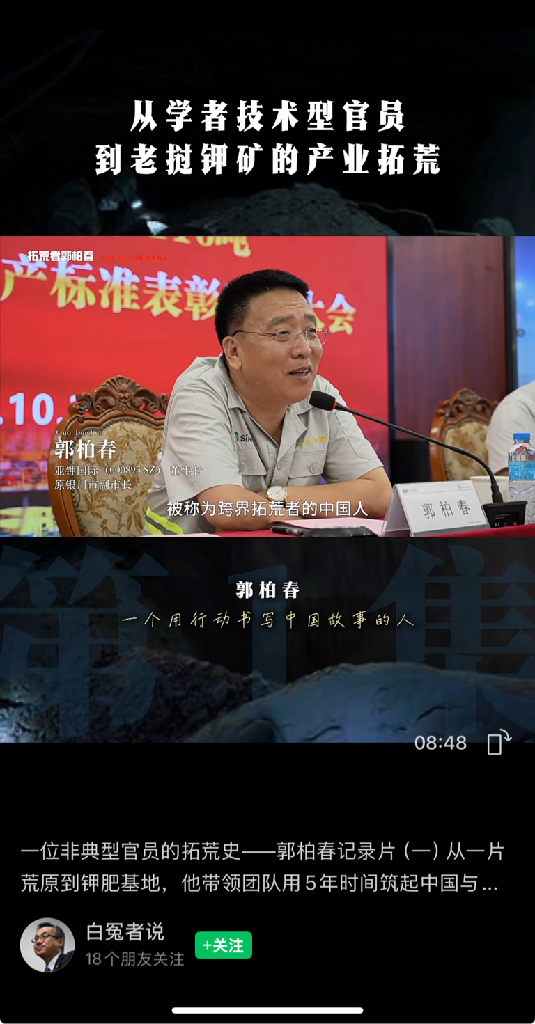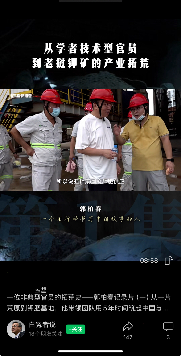 $亚钾国际(SZ000893)$ 视频号【白冤者说】刚刚发布的视频。一位非典型官员的拓荒史——郭柏春记录片(一)