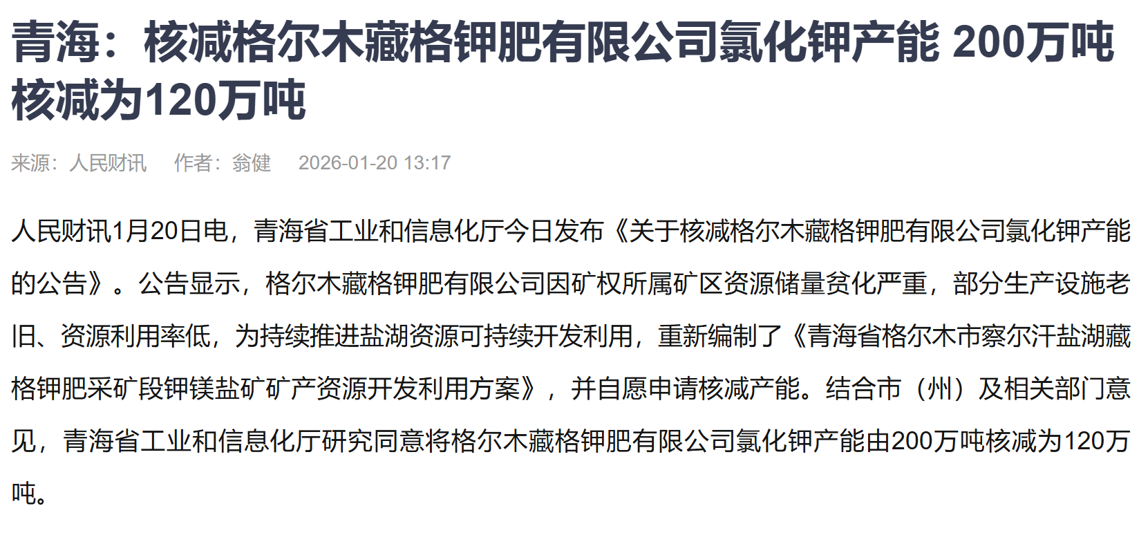 因矿区资源储量贫化严重,部分生产设施老旧、资源利用率低,藏格申请将产能由200万吨减为120万吨。我国缺钾“内忧”进一步加剧。