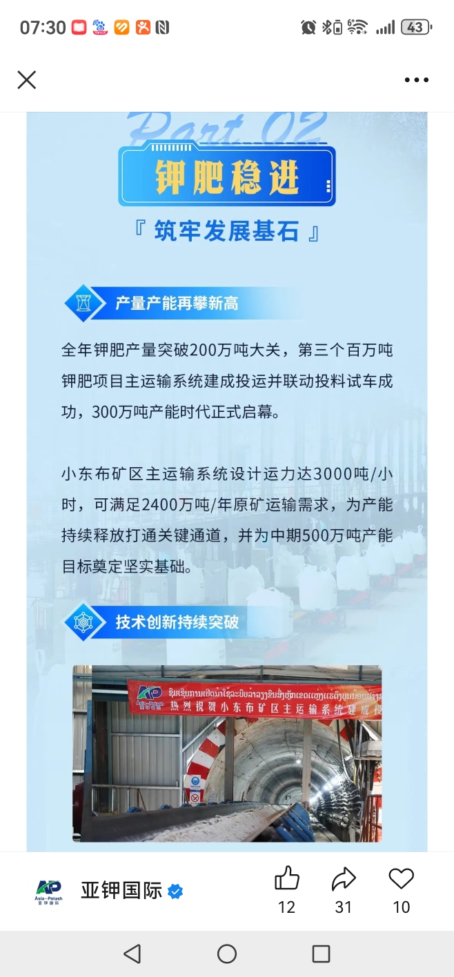 小东布的产能比较大啊,超过我的预期了。今年400万吨氯化钾产量大概率能够完成。为