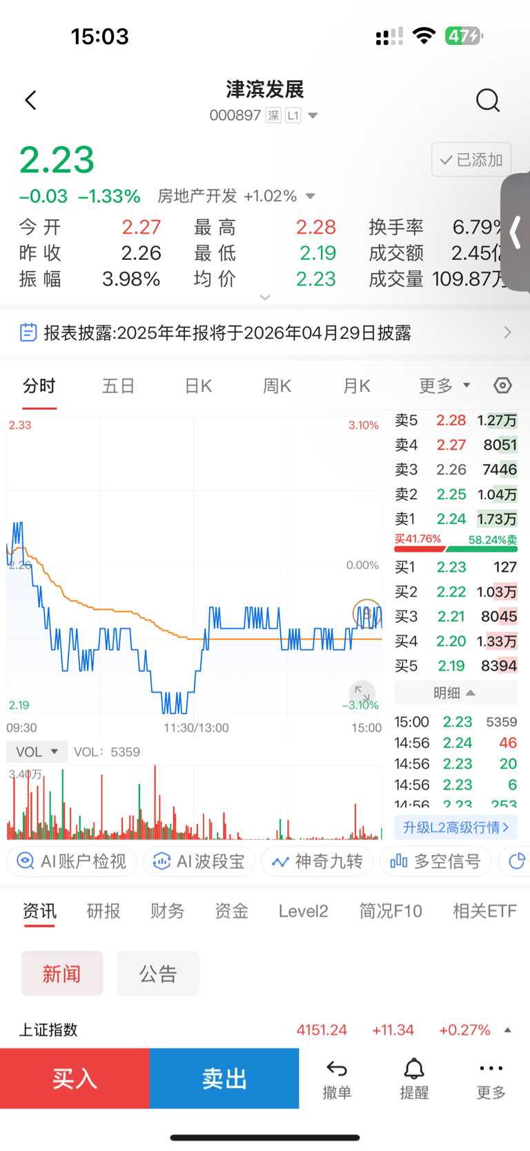 $津滨发展(SZ000897)$ #炒股日记# #强势机会# #周度策略# #投资干货# 尾盘2.23买了,买之前就是想随便买个房地产的股,但是看了评论感觉大家都觉得还会跌啊那咋办明天是不是要割肉了?