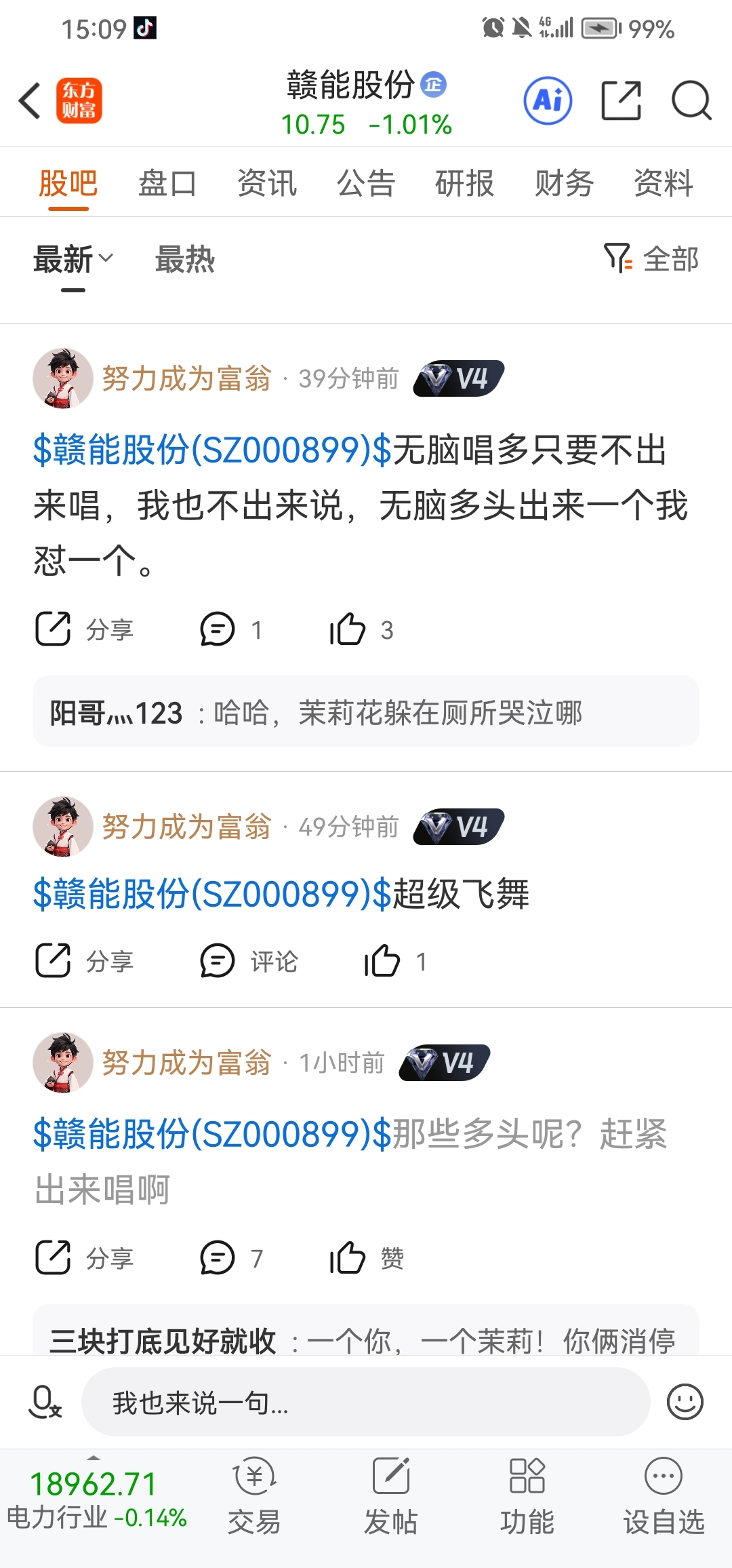 $赣能股份(SZ000899)$ 以“努力成为富婆”、“阴哥…123”、“周粑粑亡者归来”、“三块打顶见坏就收”、“亿力小股东”等为首的唱空、唱衰赣能股份的长期盘踞股吧,见到股票下跌,激动得像捡到父亲一样!早盘冲高,你们怎么PI都不放一个