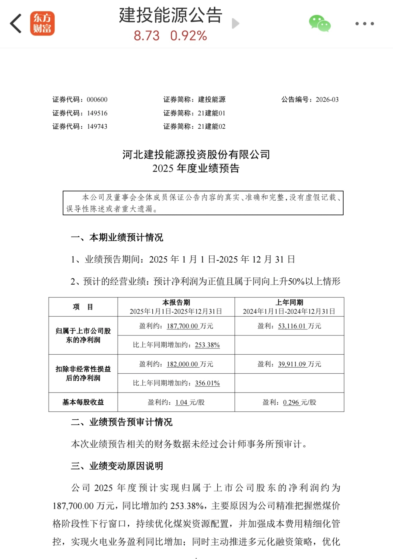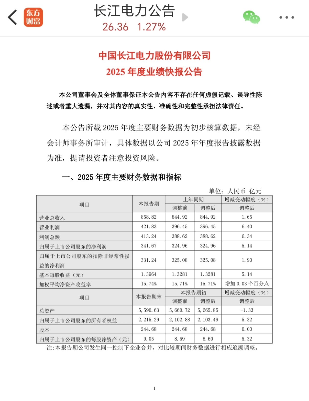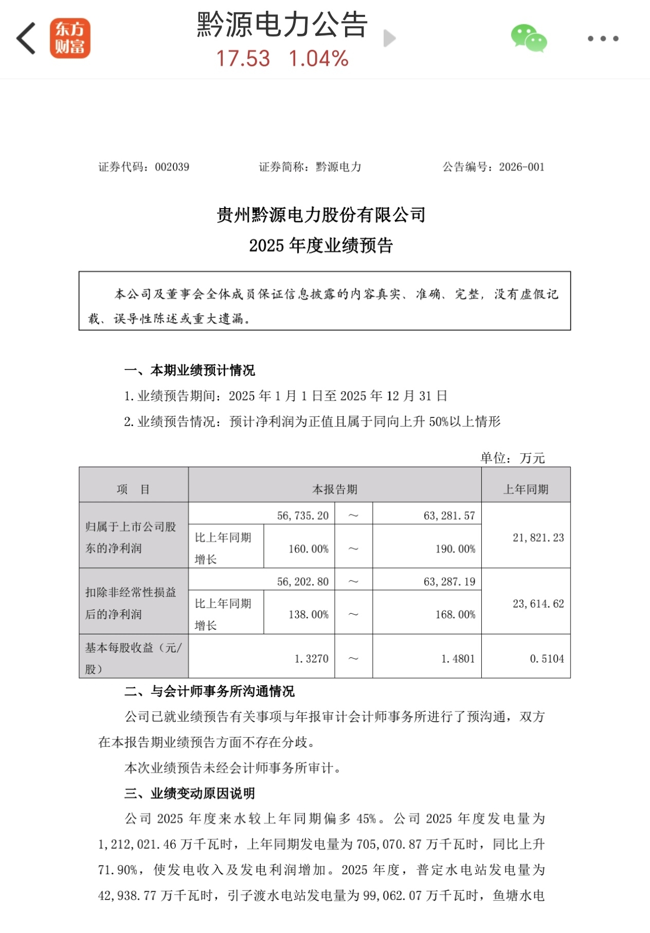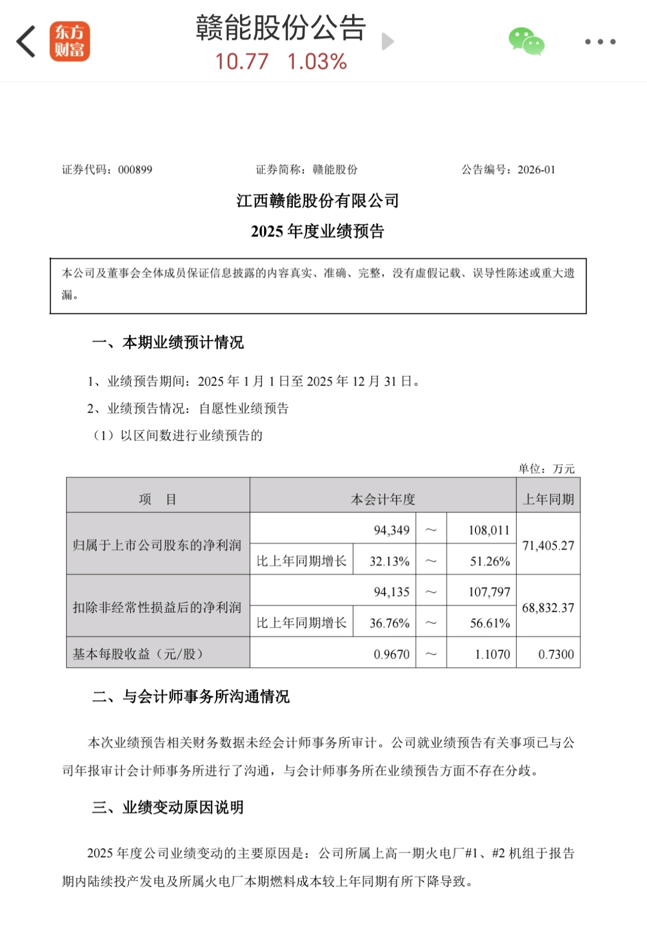 $赣能股份(SZ000899)$ 截止目前披露的2025年业绩预告,电力行业上市公司80多家中,业绩最优秀的四家在这里:长江电力(1.3964元/股)、黔源电力(1.327~1.4801元/股)、建投能源(1.04元/股)、赣能股份(0.967~1.107元/股)。业绩虽然优秀,股价要看市场情绪及风口。风来了,母猪也会上树!仅供参考!股票有风险,入市须谨慎!盈亏自负!
