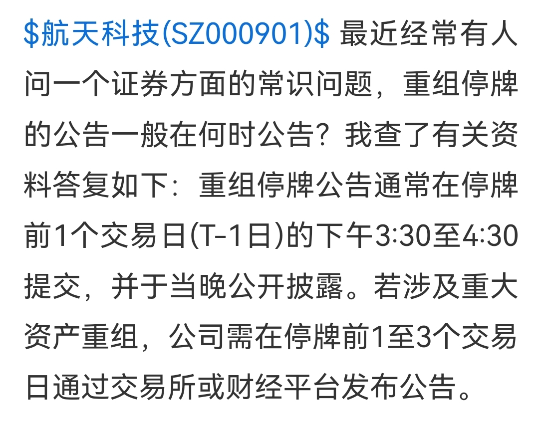 $航天科技(SZ000901)$ 早晨我还发了一个帖子,有关重组的机会把握,因为我认为风在吹,马在吼了!帖子内容如下:《最近经常有人问一个证券方面的常识问题,重组停牌的公告一般在何时公告?我查了有关资料答复如下:重组停牌公告通常在停牌前1个交易日(T-1日)的下午3:30至4:30提交,并于当晚公开披露。若涉及重大资产重组,公司需在停牌前1至3个交易日通过交易所或财经平台发布公告。》