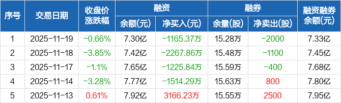 融资方面,当日融资买入5040.29万元,融资偿还6205.66万元,融资净偿还1165.37万元,连续4日净偿还累计6173.36万元。融券方面,融券卖出0股,融券偿还2000股,融券余量15.28万股,融券余额276.42万元。融资融券余额合计7.33亿元。
