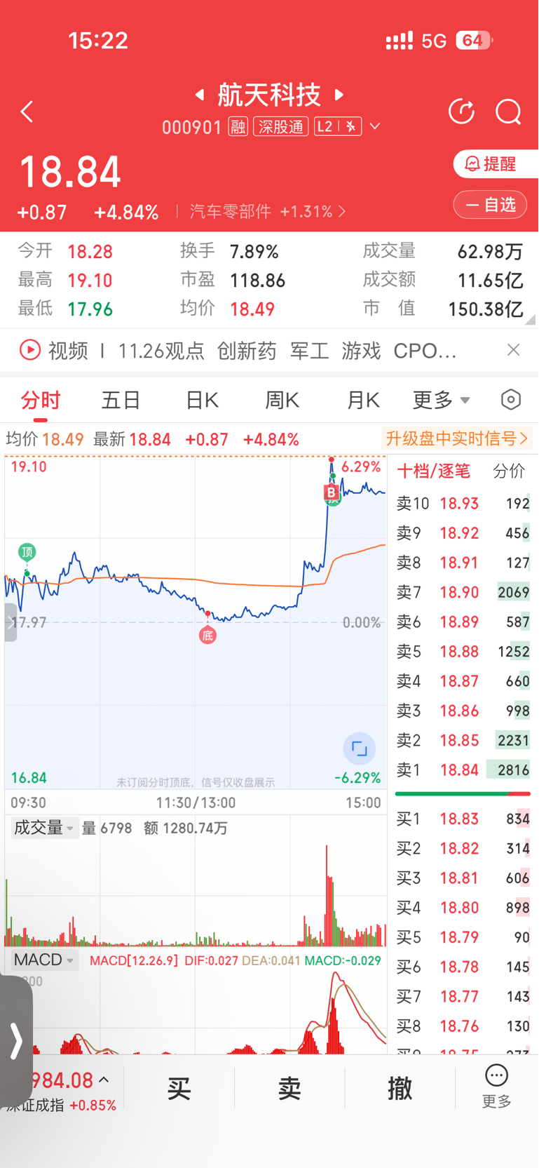 这个月我感觉是幸运的,利润没有回吐。但是今天航天科技买到了最高19.09位置近期