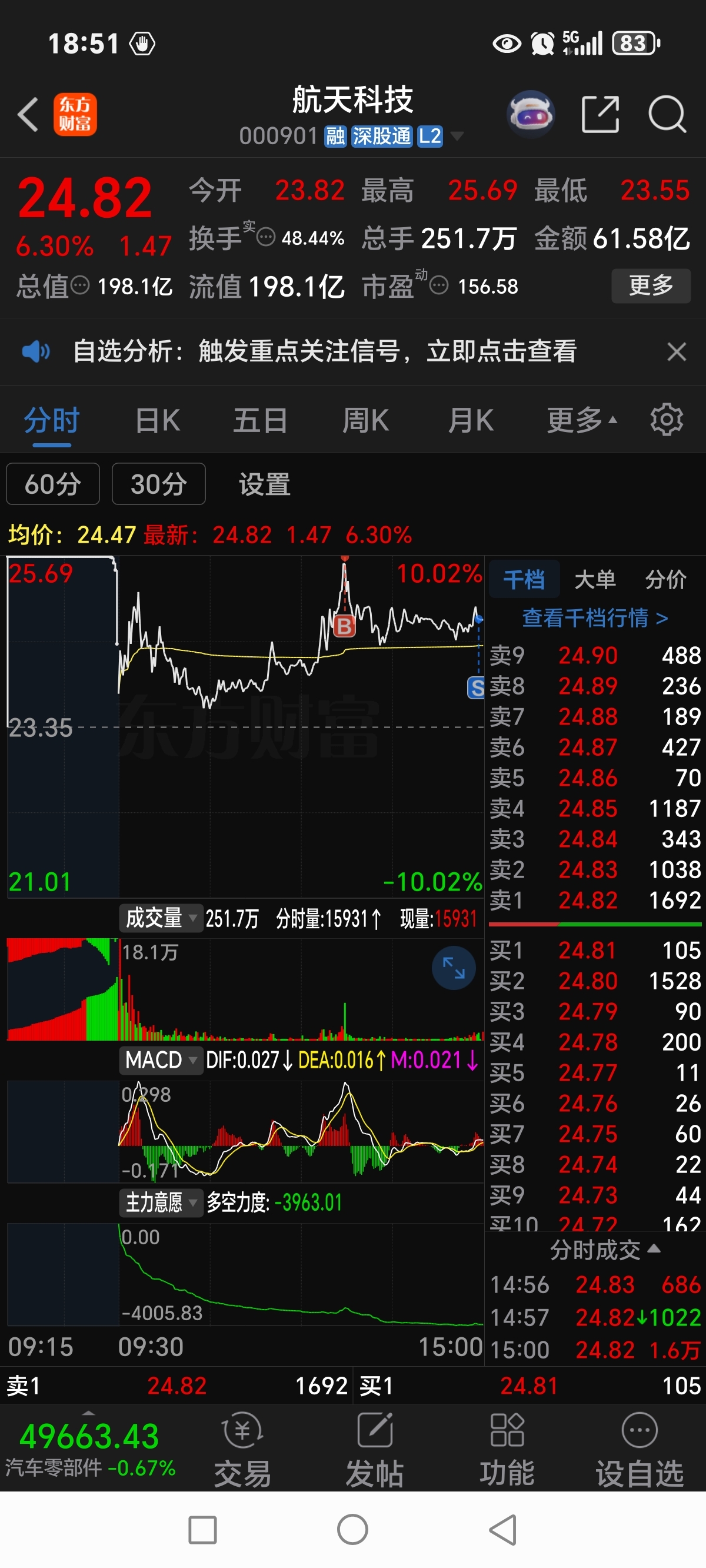 $航天科技(SZ000901)$ 打板失败,明天应该会低开