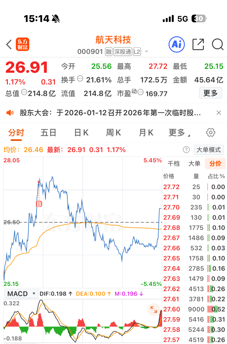 $航天科技(SZ000901)$ 给我挂山顶了