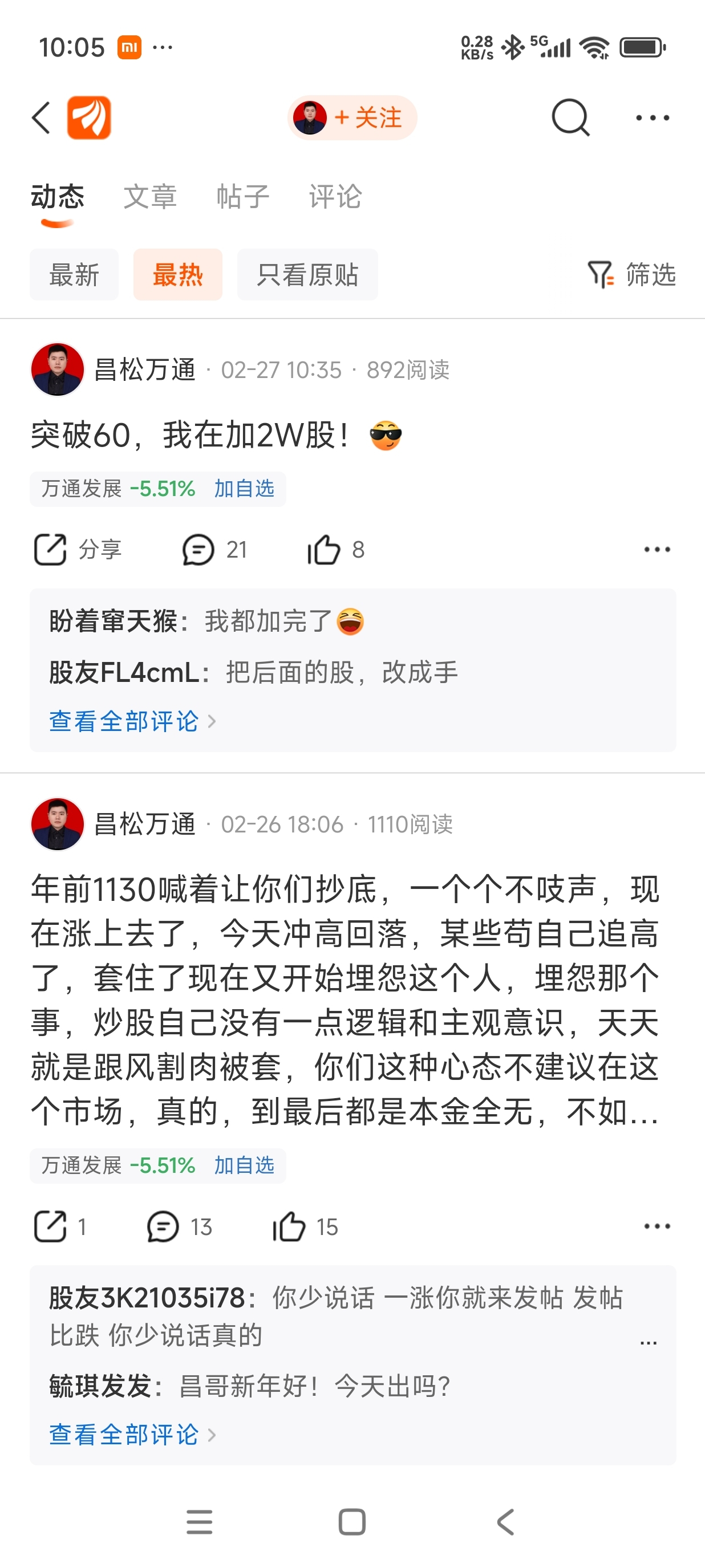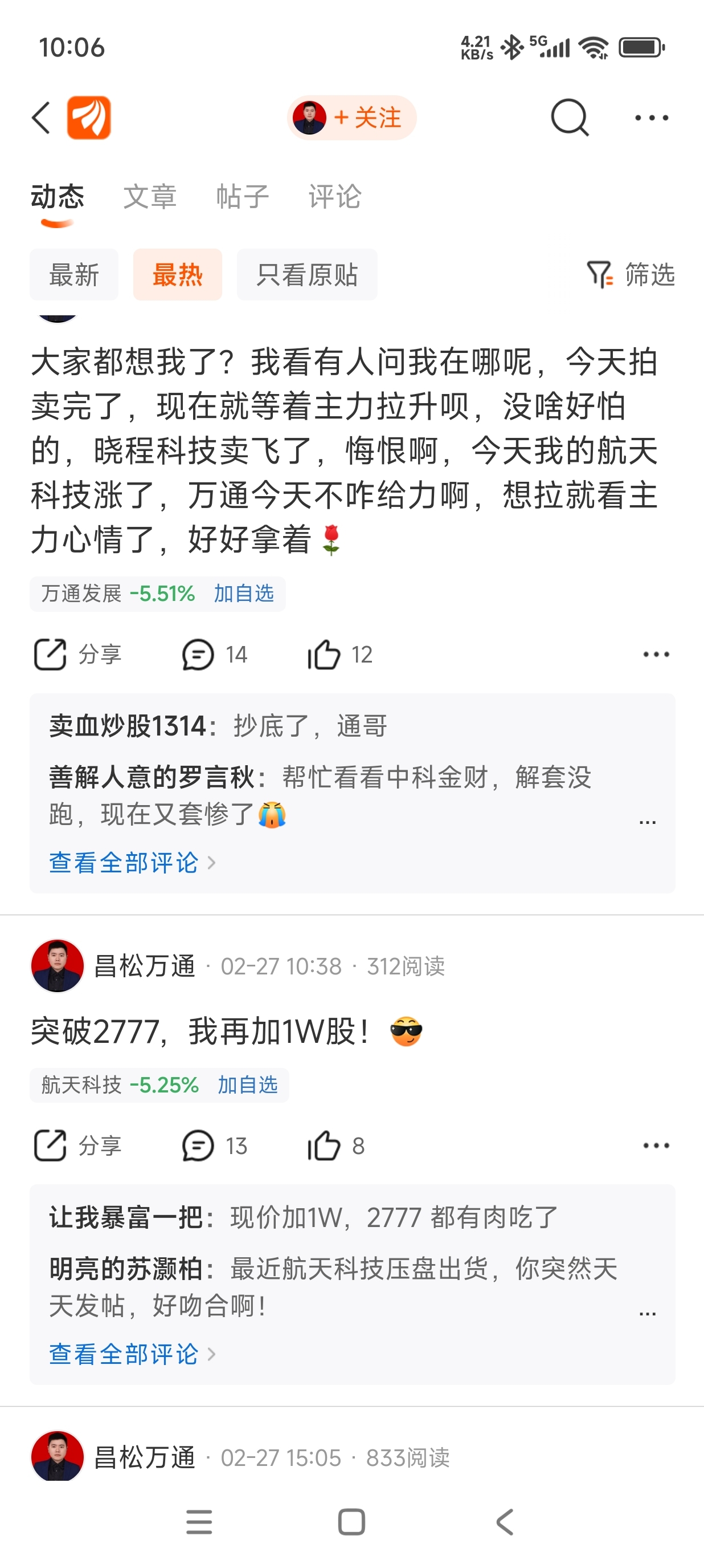 每天一帖,(航天科技 万通发展 )让散户买 拿住,这就是天天唱多的结果!俩个股出货大跌,还说自己不是托