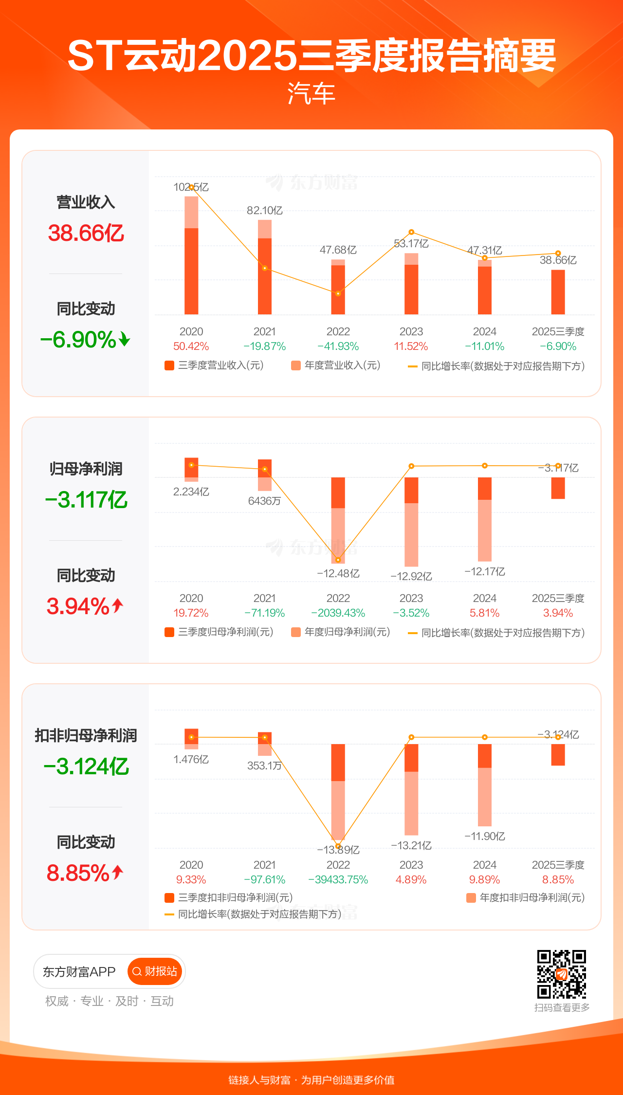 ST云动10月30日发布2025年三季报显示,公司前三季实现营业收入38.66亿元,同比下滑6.90%;归母净利润-3.12亿元;扣非归母净利润-3.12亿元。
