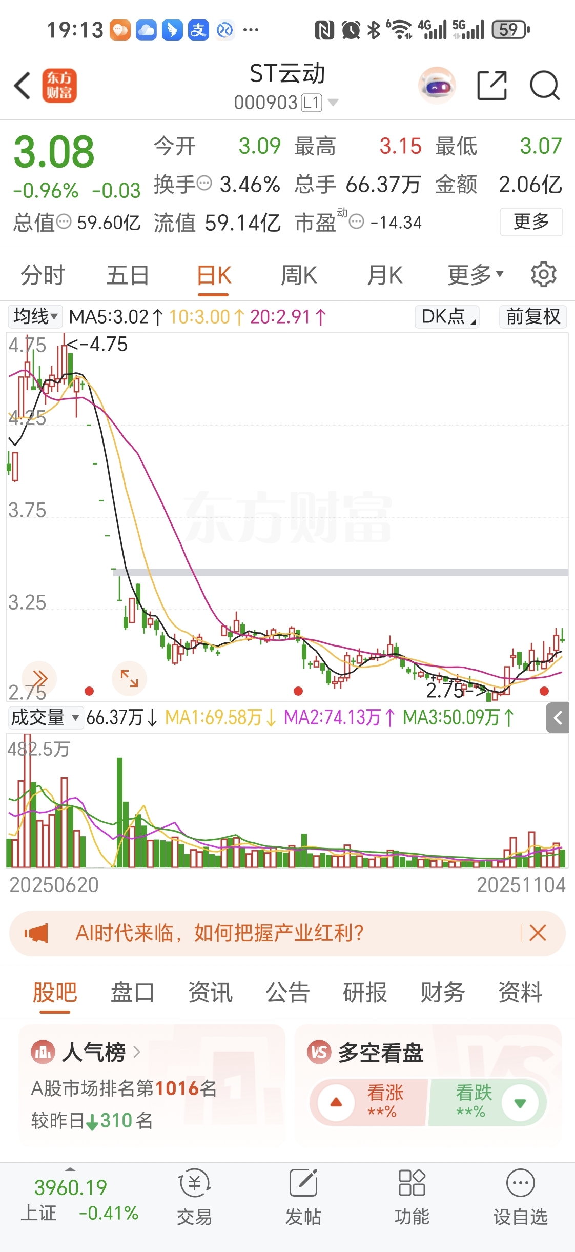 $ST云动(SZ000903)$ 云动开板后,离最低点,居然还下跌了17个点左右