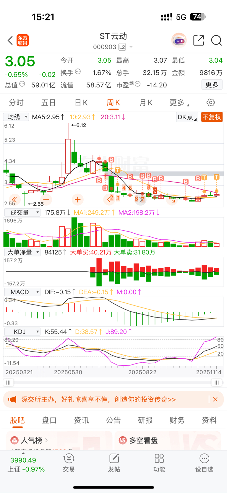 $ST云动(SZ000903)$ 耐心拿好,磨磨更锋利,周k马上金叉,明年申请摘帽,除非今年再亏15个亿,净资产为负才会被强制退市