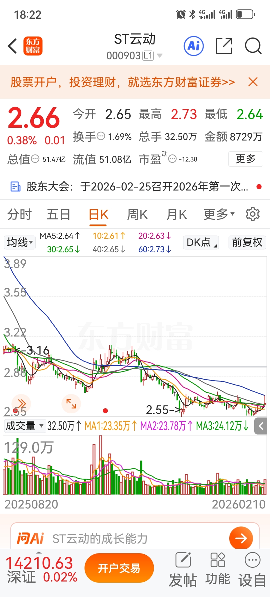 $ST云动(SZ000903)$ 如果是底部,成交量应该有一次突然放量日,放量之后回调下来。准备加入。