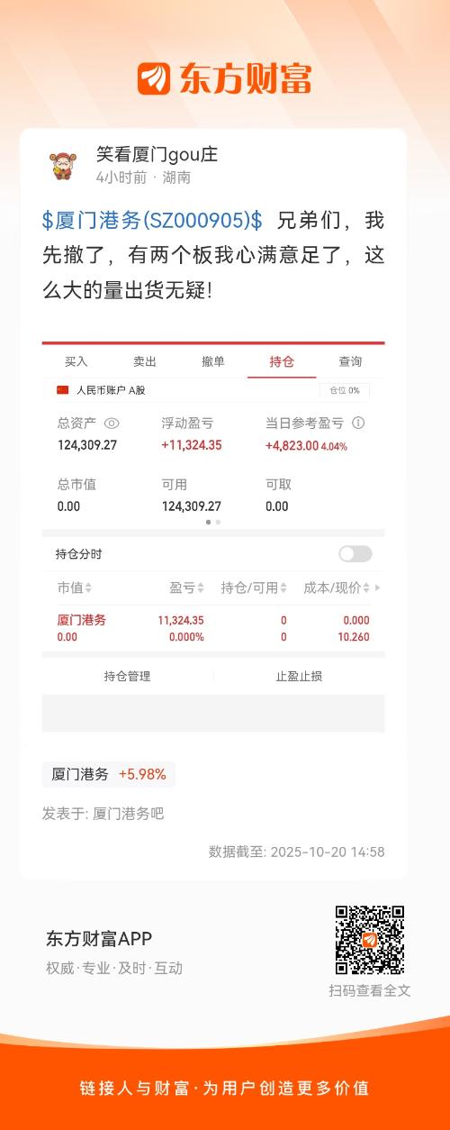 $厦门港务(SZ000905)$  兄弟们,我先撤了,有两个板我心满意足了,这么大的量出货无疑!