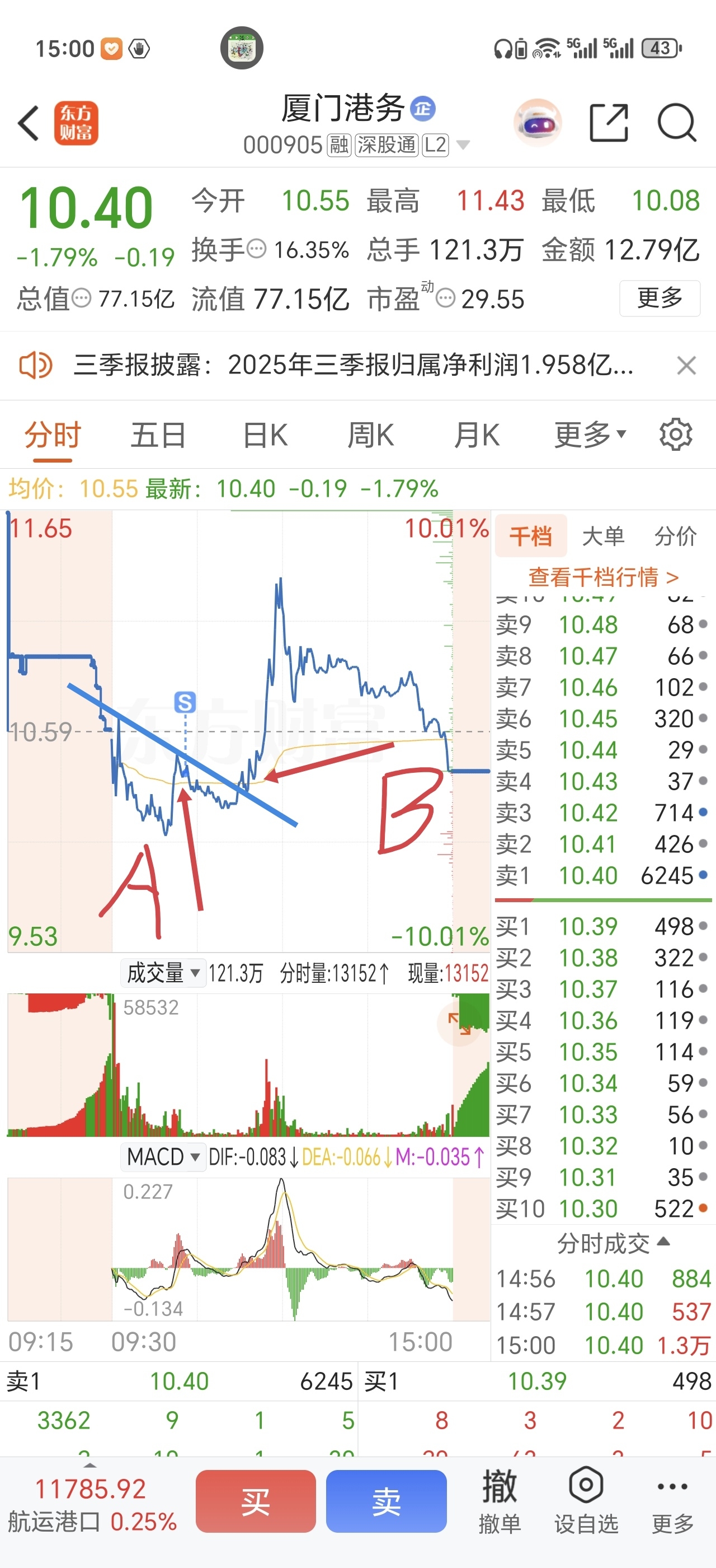 在A点突破不了直接出了,后面在B点突破分时,想重新T,再次介入,又打消了念头。因为他开局和A点都表现出很弱的信号。果不其然今天又是低吸高抛的套利……今天套利结束了,明天不好办咯……卖飞就卖飞吧,哎……庄太毒。
