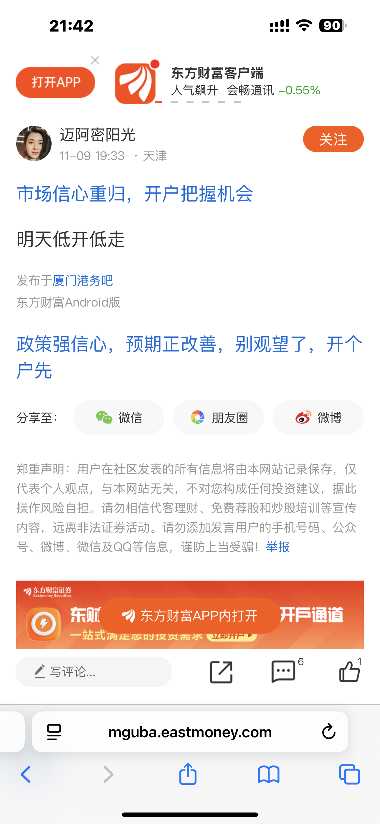 温馨提示: 1.根据《证券法》规定,禁止编造、传播虚假信息或者误导性信息,扰乱证券市场;2.用户在本社区发表的所有资料、言论等仅代表个人观点,与本网站立场无关,不对您构成任何投资建议。用户应基于自己的独立判断,自行决定证券投资并承担相应风险。《东方财富社区管理规定》