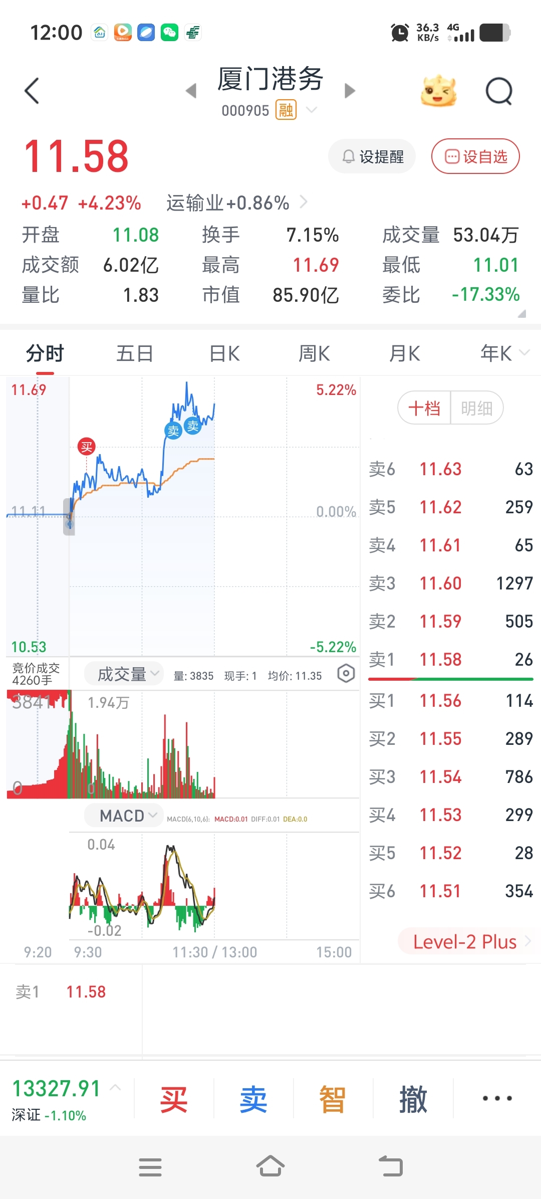 $厦门港务(SZ000905)$ 上午在这T了一把,预估下午收盘6个点左右!