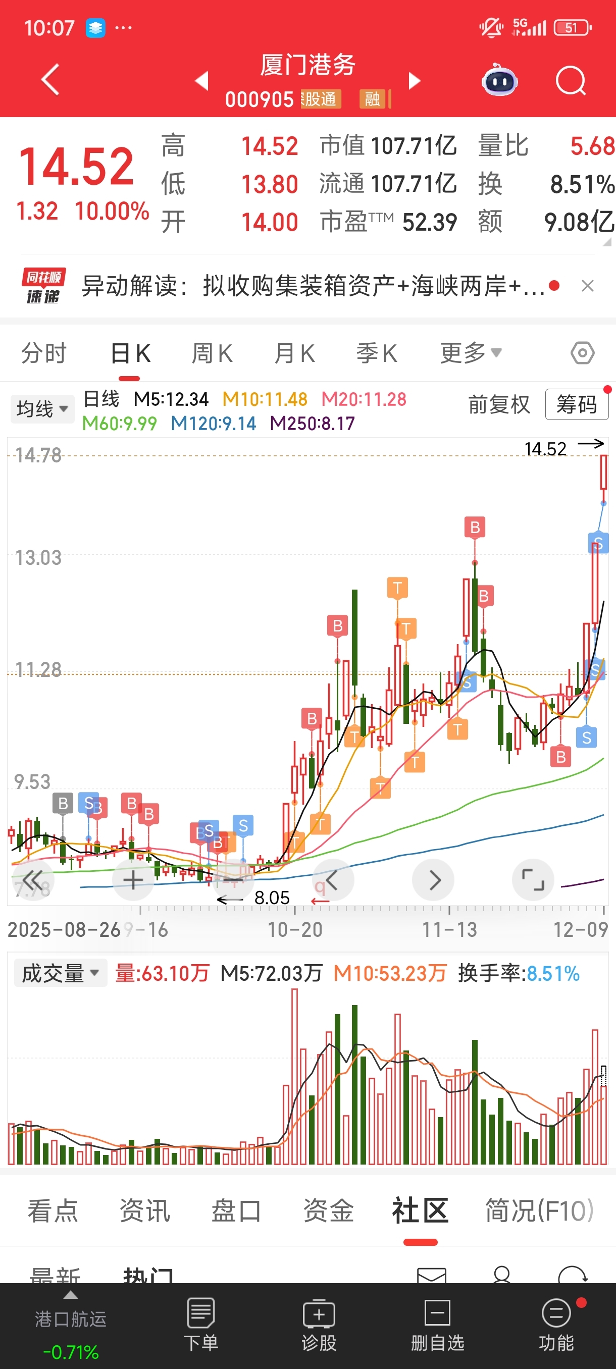 $厦门港务(SZ000905)$ 从8月拿到现在,持仓四个月,今天涨停反复开板就一键清仓了,以我的认知只能拿到这里。原计划拿到20的,可是一路拿下来,才知道那些能拿到翻一倍,甚至翻几倍的大神是多么牛逼。祝车上的各位继续发财,希望厦门港务能涨到20以上,甚至破历史新高。