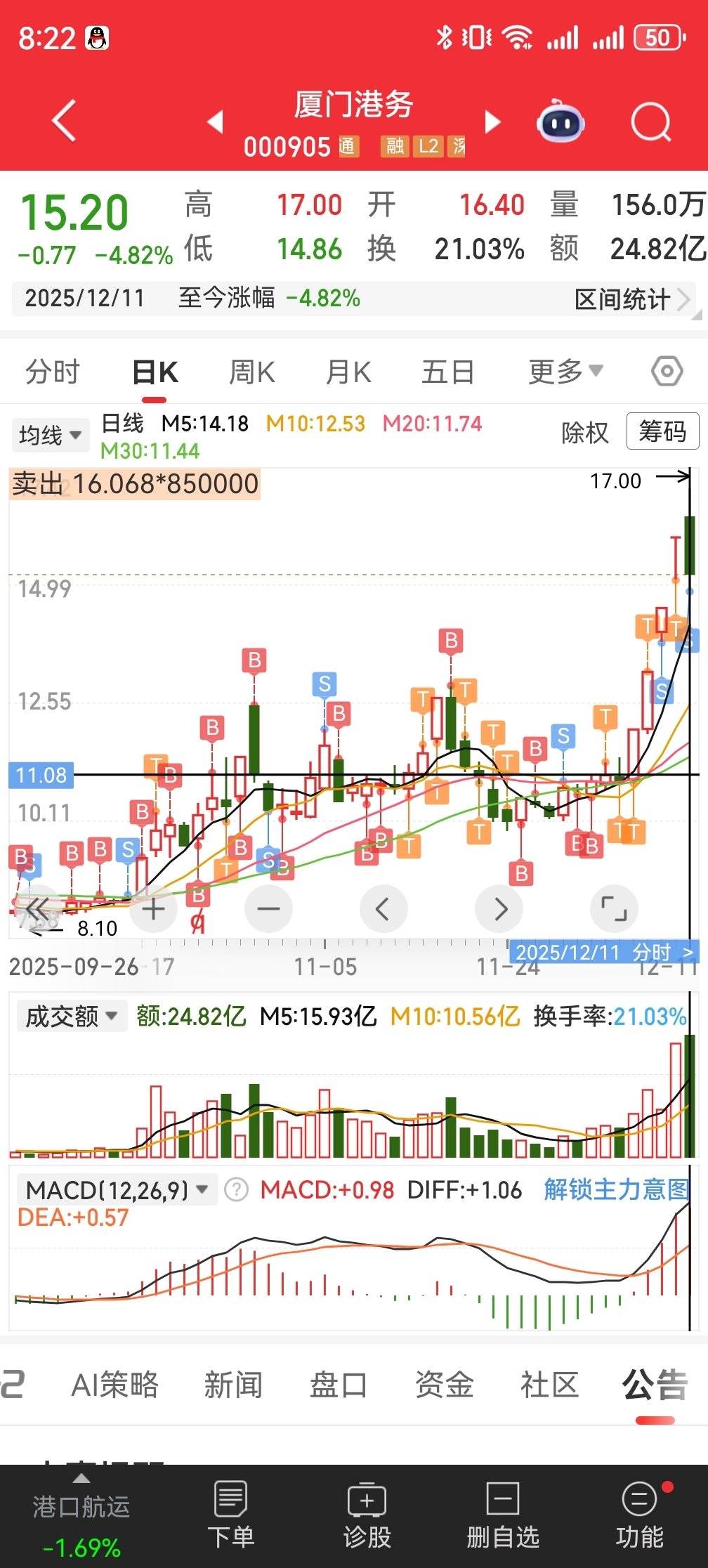 $厦门港务(SZ000905)$ 3个多月的守护今天终于清仓了,达到我16元标准了,留了点点作个纪念,剩下的友友们祝你们发财,我在渤海汽车等你们