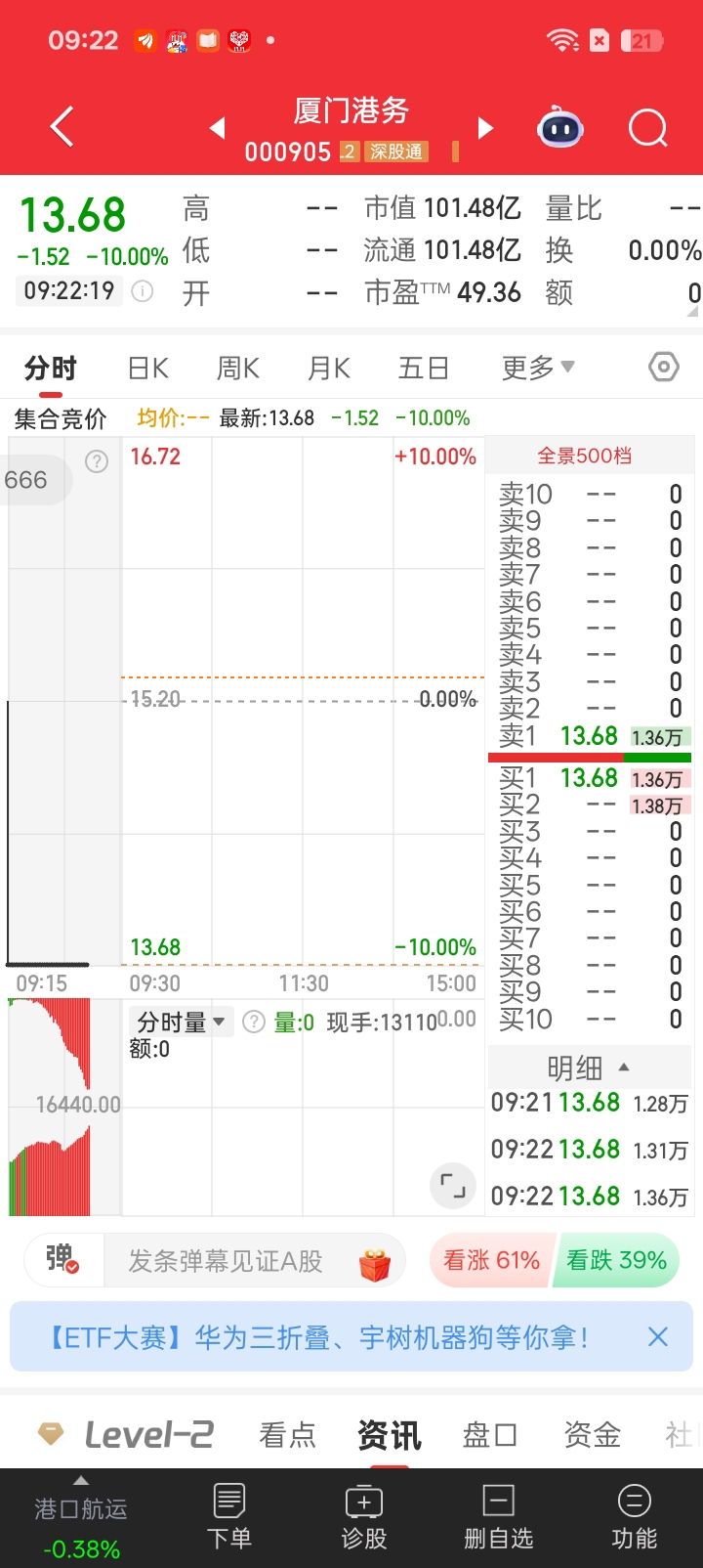 $厦门港务(SZ000905)$ 9:25红盘开