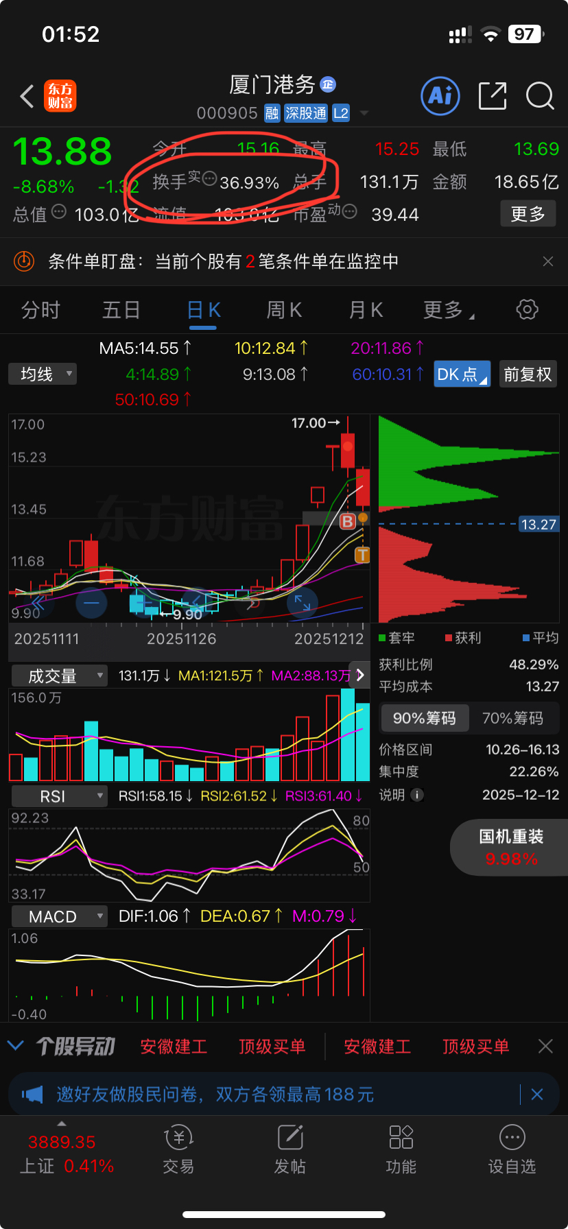 $厦门港务(SZ000905)$ 下跌破位5日线,换手实际36.93%,出货是肯定的,还有抱有幻想下周给各位小散解套的,下周一给我解套,我都卖给你们,谁想要,让我回本全部卖给你