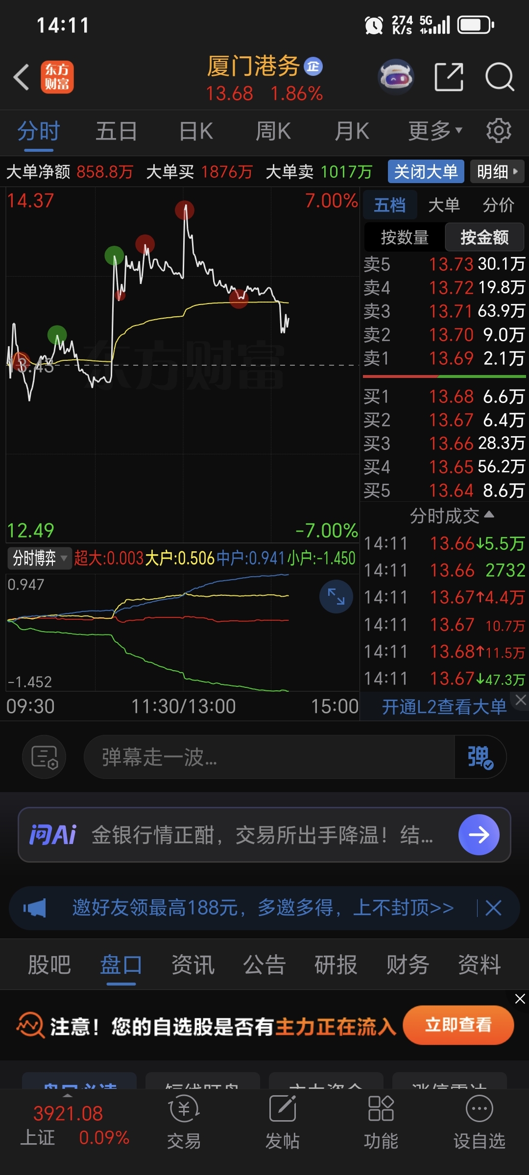 $厦门港务(SZ000905)$ 散户出逃,主力不见庄,老是上不去,主力进散户才会跟着进,那才会涨停