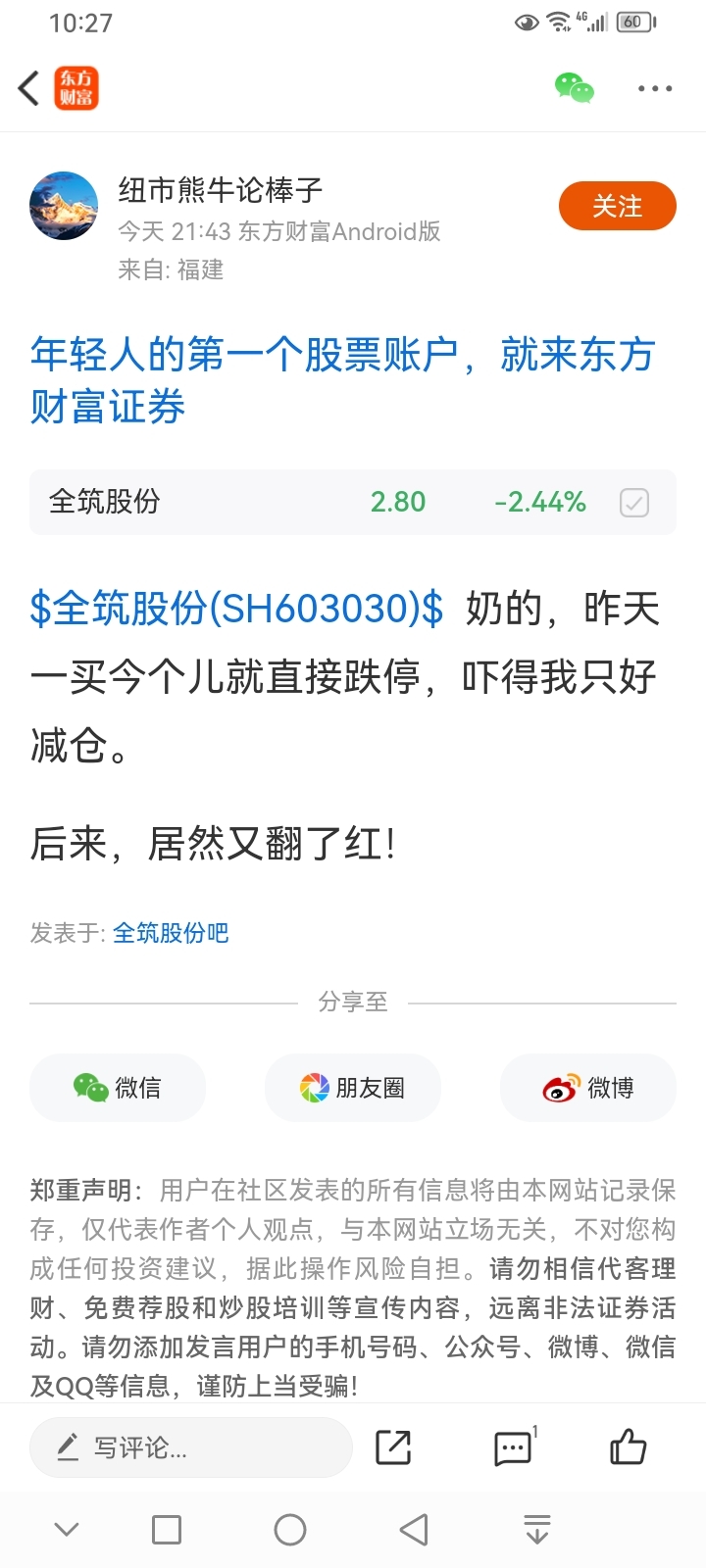温馨提示: 1.根据《证券法》规定,禁止编造、传播虚假信息或者误导性信息,扰乱证券市场;2.用户在本社区发表的所有资料、言论等仅代表个人观点,与本网站立场无关,不对您构成任何投资建议。用户应基于自己的独立判断,自行决定证券投资并承担相应风险。《东方财富社区管理规定》
