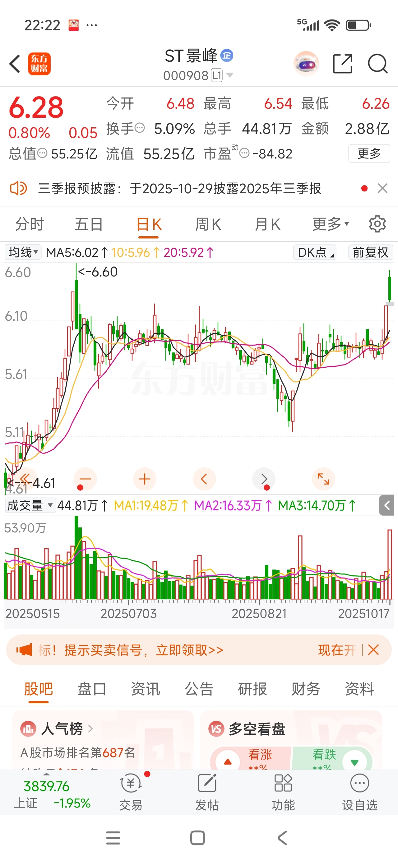 $ST景峰(SZ000908)$ 为啥东财显示上面K线是绿的,下面成交量又是红的?