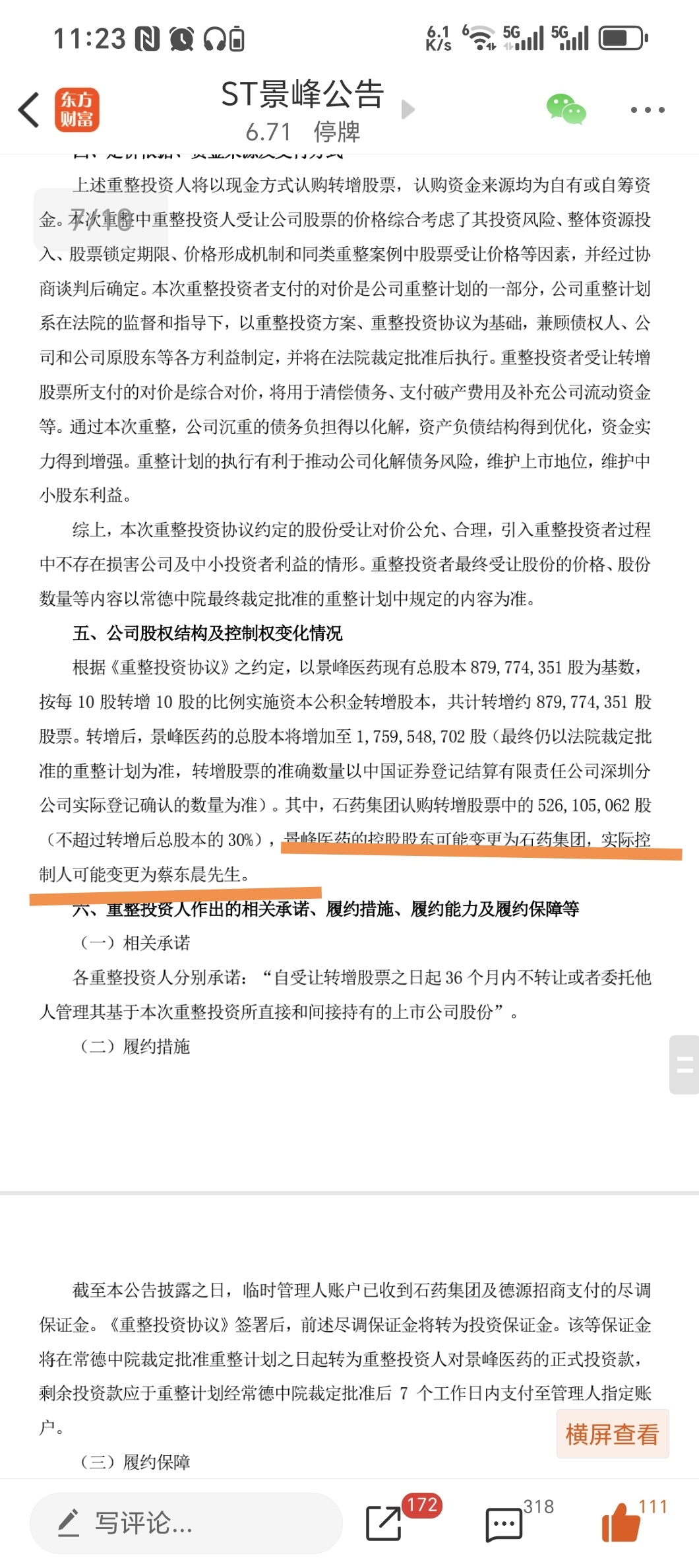 犹记去年,刚开始大股东否定重整;差点退市;后来重整引投资人,条件苛刻,为石药量身