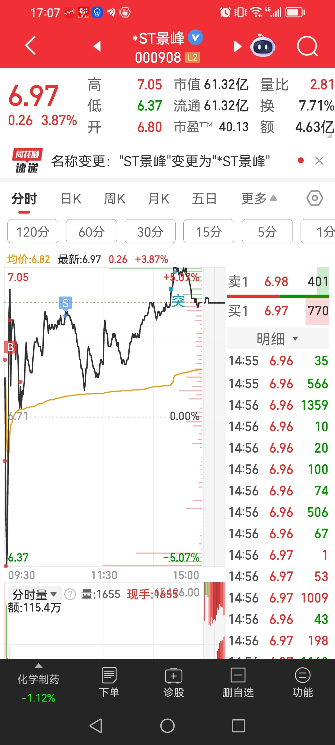$*ST景峰(SZ000908)$ 没一字板。那就做T,以后再也不傻傻的拿着,T一T才有肉吃。