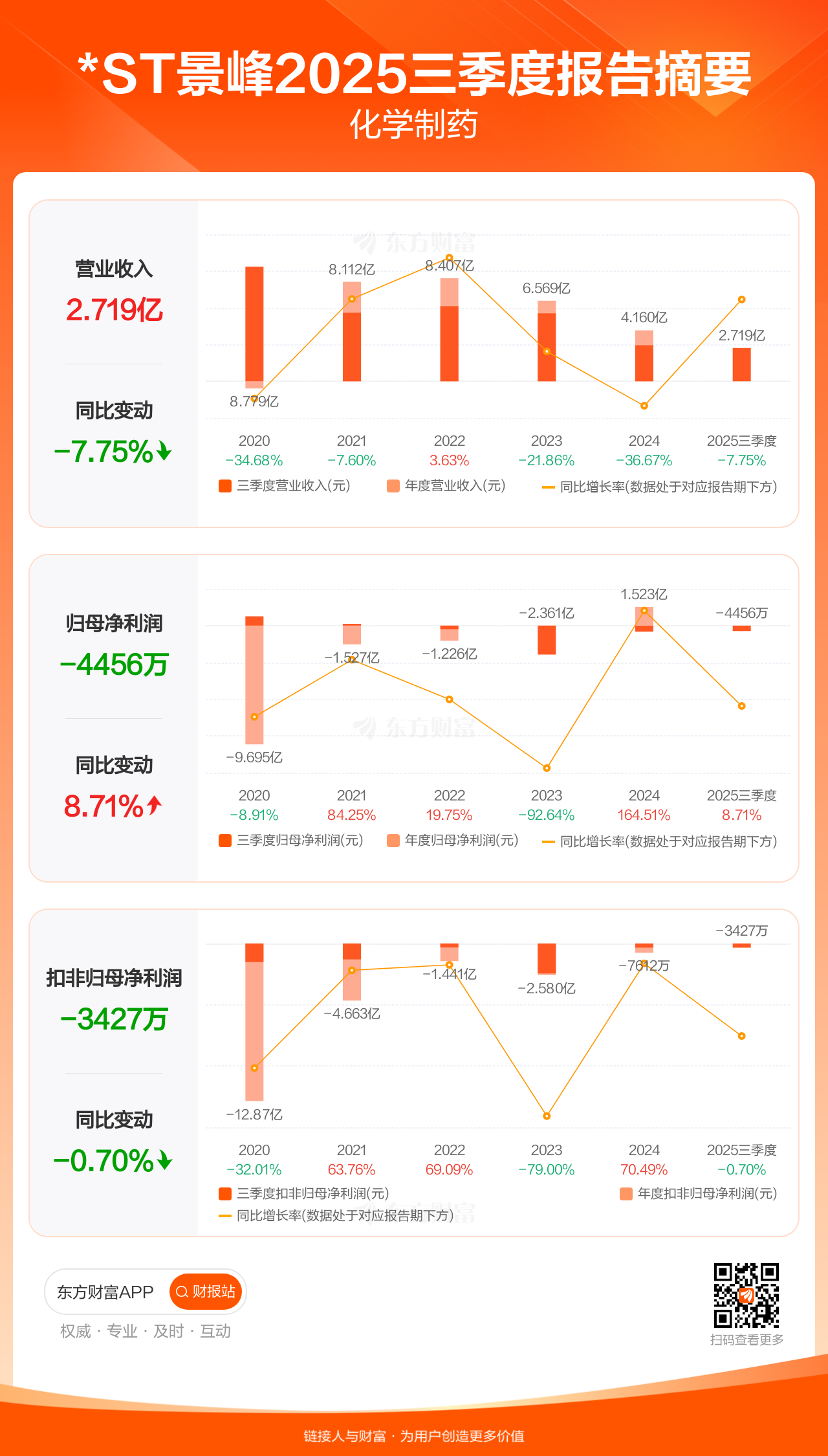 *ST景峰10月29日发布2025年三季报显示,公司前三季实现营业收入2.72亿元,同比下滑7.75%;归母净利润-4456.49万元;扣非归母净利润-3427.28万元。