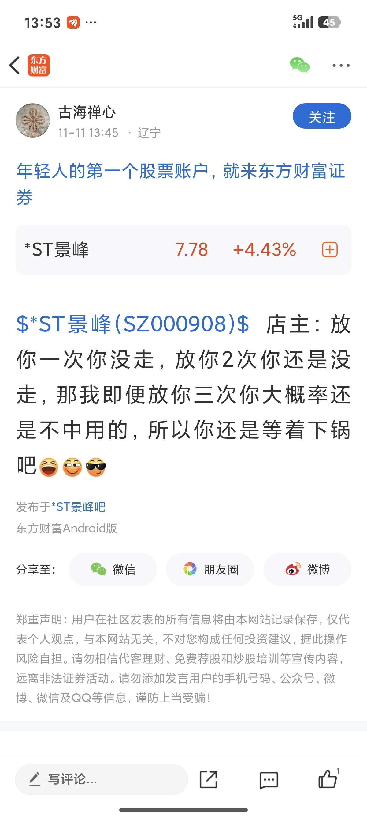 温馨提示: 1.根据《证券法》规定,禁止编造、传播虚假信息或者误导性信息,扰乱证券市场;2.用户在本社区发表的所有资料、言论等仅代表个人观点,与本网站立场无关,不对您构成任何投资建议。用户应基于自己的独立判断,自行决定证券投资并承担相应风险。《东方财富社区管理规定》