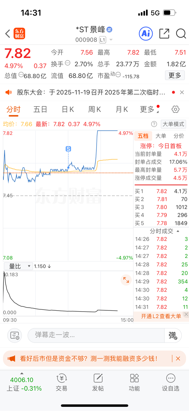 $*ST景峰(SZ000908)$ 我一出就涨停,真的这样嘛